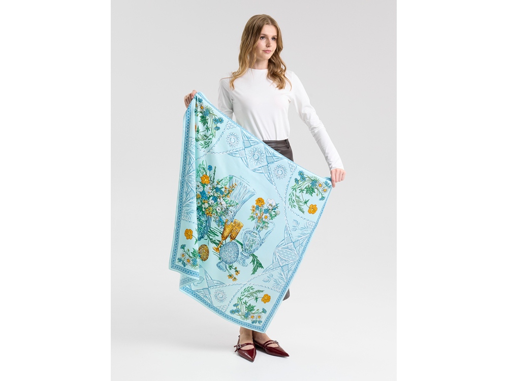 Дизайн платка связан со стилевой эстетикой советской школы натюрморта. Перед нами ажурная скатерть стола, декорированного композицией из хрусталя и полевыми цветами. Нежные переливы сине-голубых тонов подчеркнуты ярко-желтыми и белыми бутонами, стеблями сочных трав и золотистыми бокалами. Ажур скатерти вторит хрустальному узору фужеров, ваз и сувенирных пасхальных яиц, задавая душевное настроение.