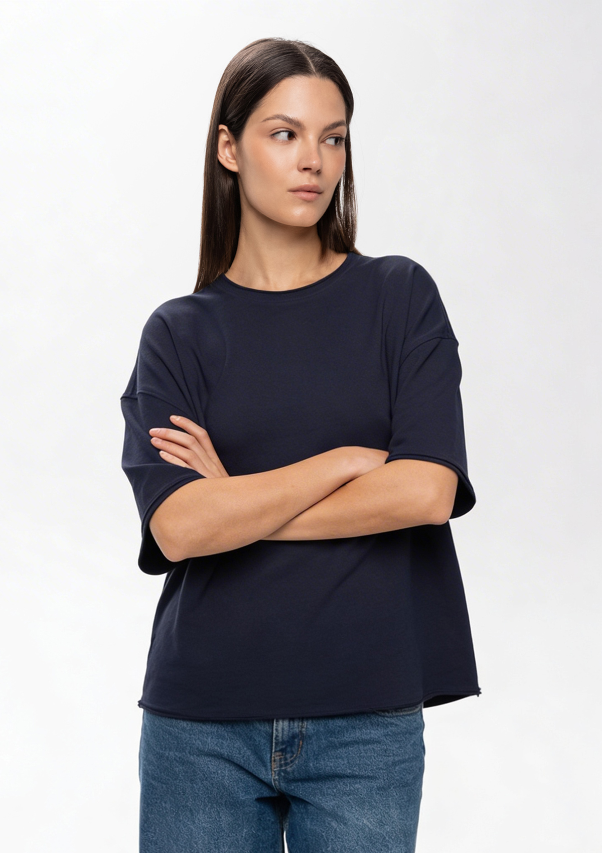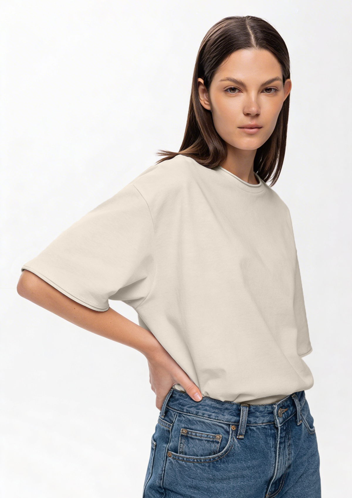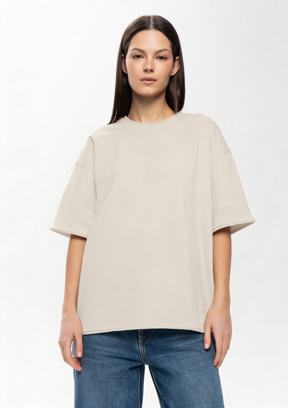 Футболка оверсайз-силуэта со спущенной линией плеча и необработанным краем рукава, горловины и по низу изделия.