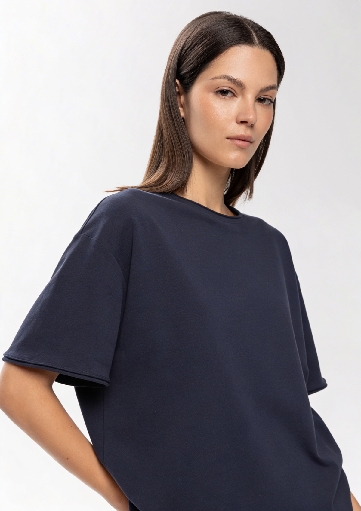 Футболка свободного силуэта с необработанными краями поможет создать стильный и неформальный образ. Данную футболку легко сочетать с джинсами, юбками и шортами, что делает модель универсальным выбором как для мероприятий, так и для униформы.
