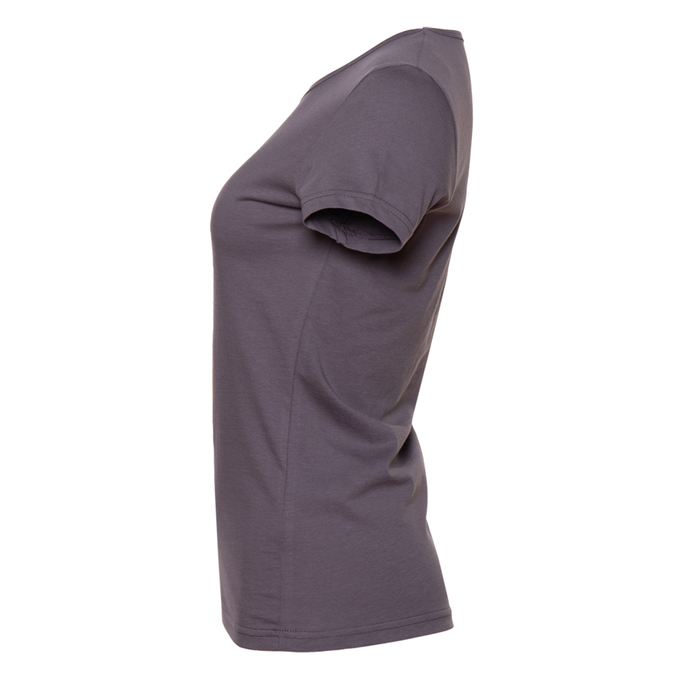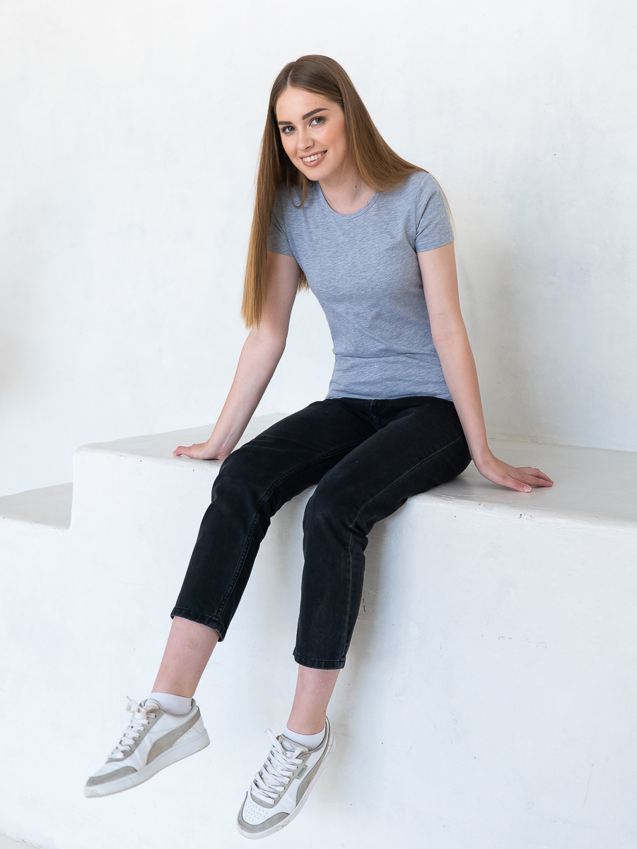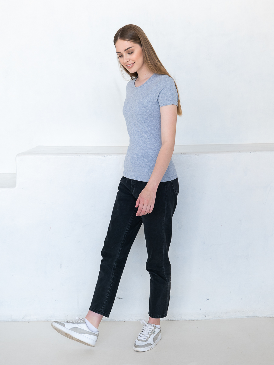Женская футболка приталенного силуэта с округлым воротом и втачным рукавом.