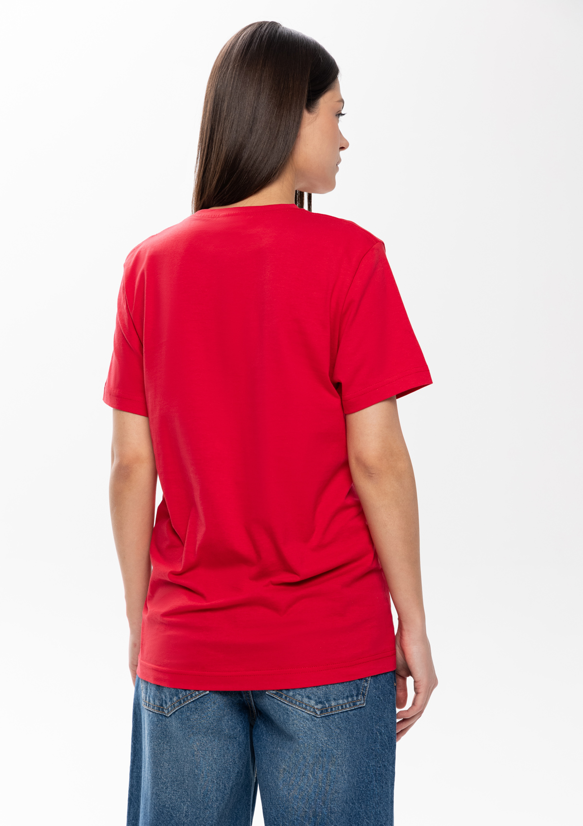 Размер женской футболки: S/46. Параметры модели: рост 173 см.; обхват груди 80 см.; обхват талии 58 см.; обхват бедер 89 см.