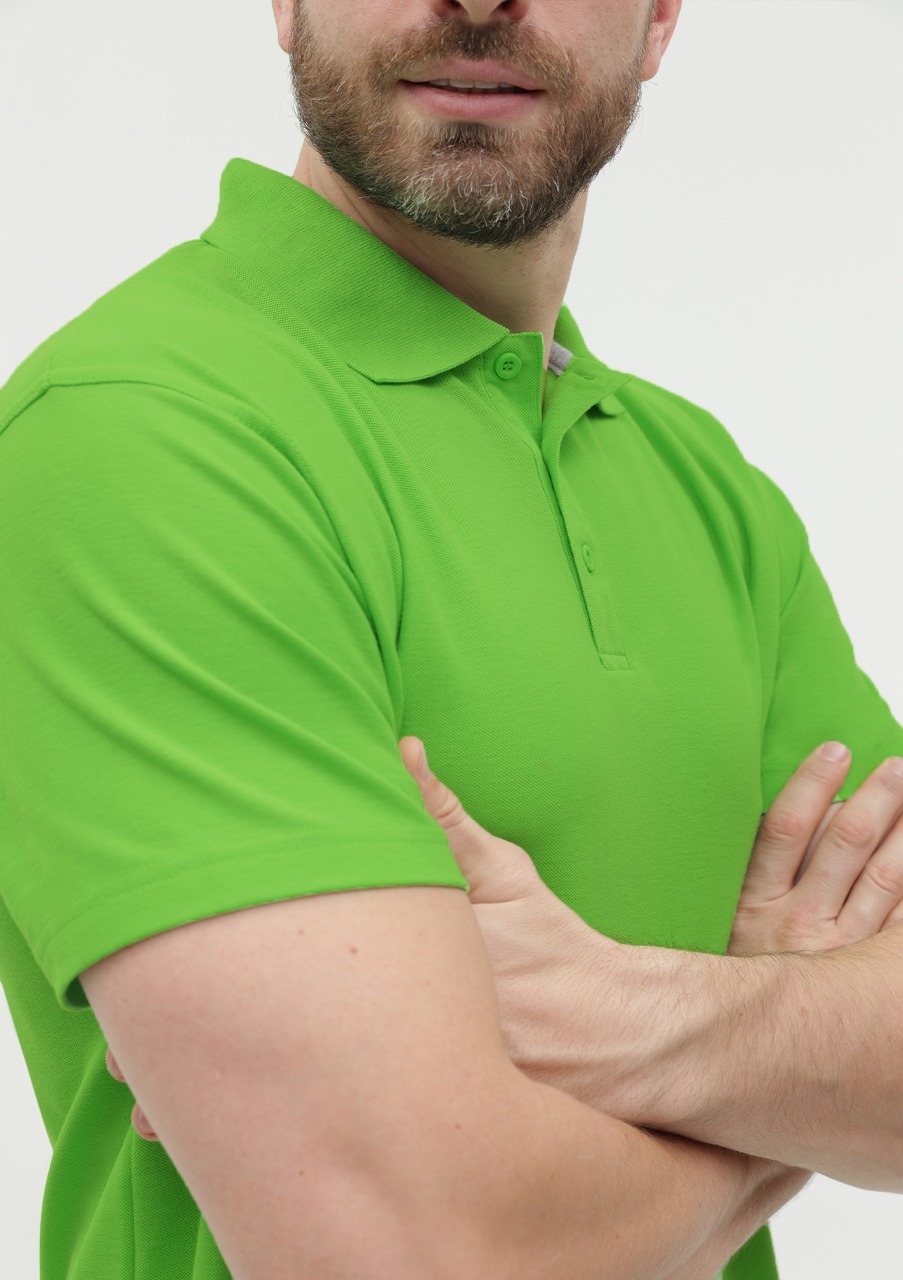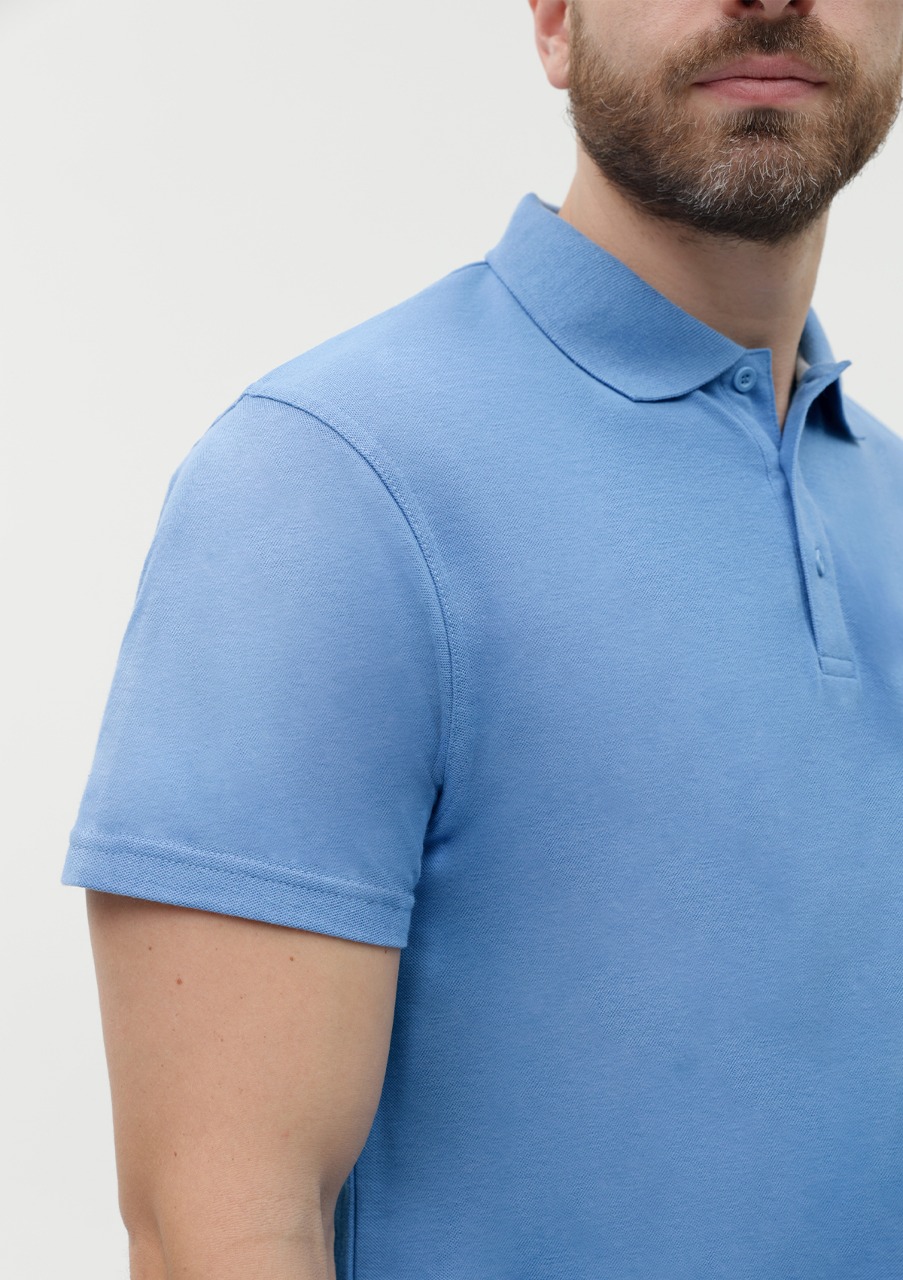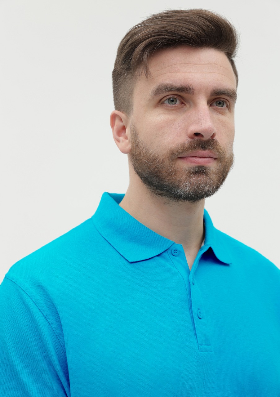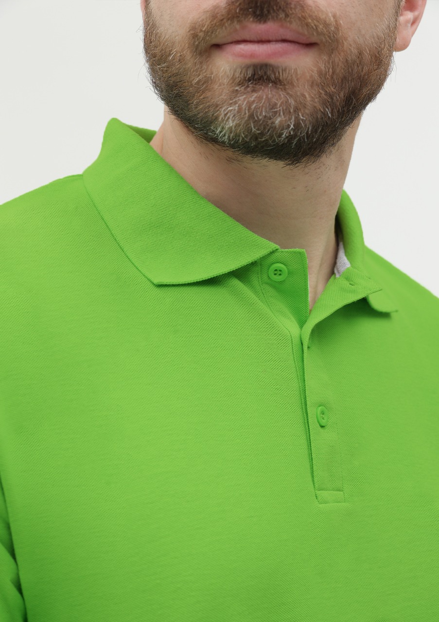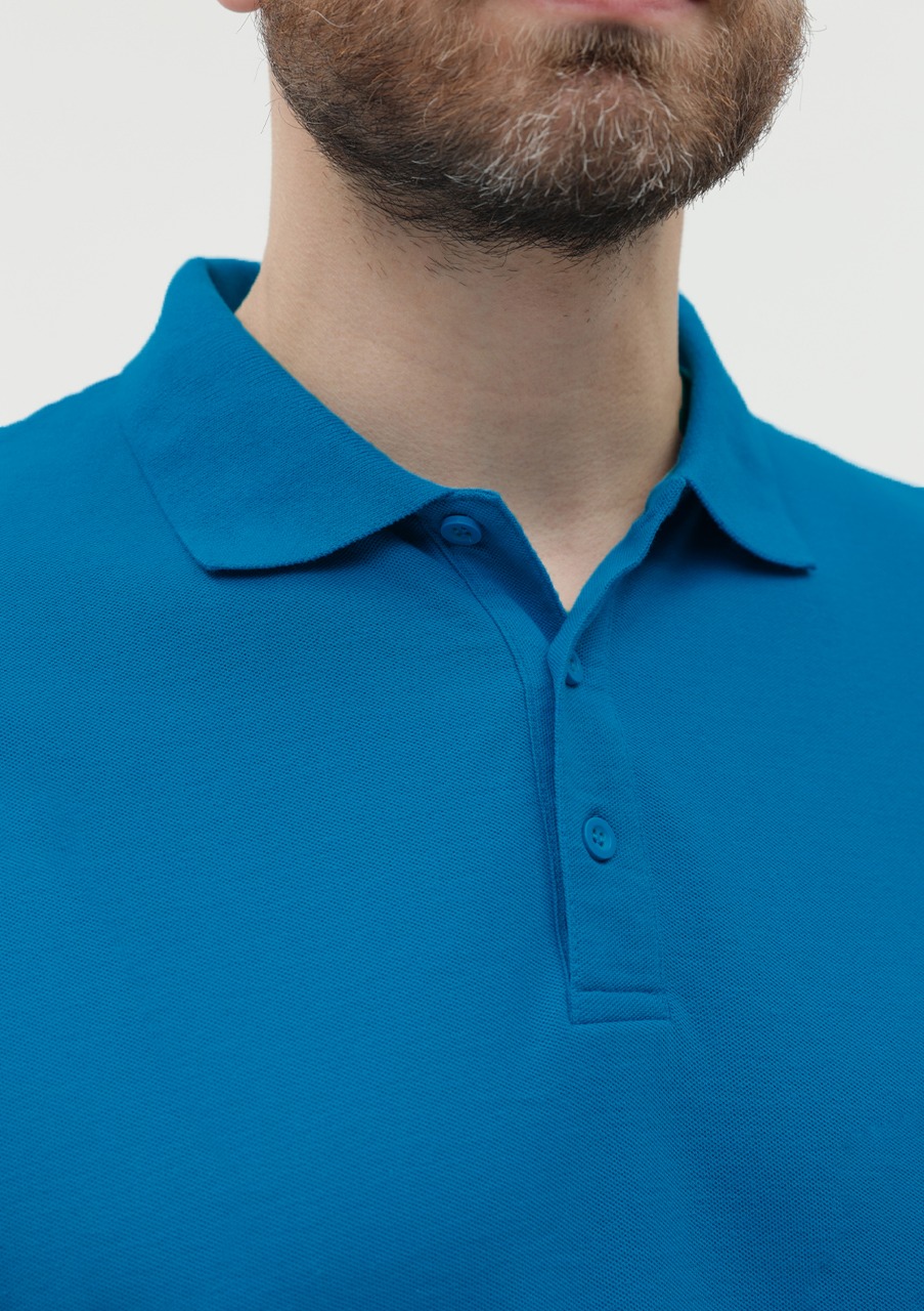 Поло выполнено из фактурной смесового ткани (65% хлопок, 35% полиэстер), благодаря чему изделие хорошо пропускает воздух и практически не мнется.