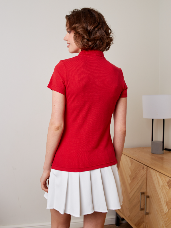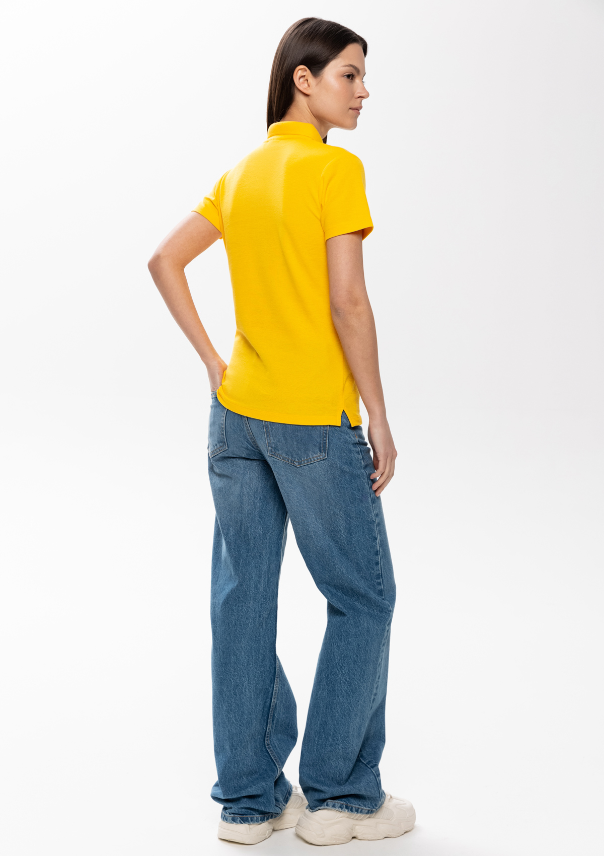 Женская рубашка поло приталенного силуэта с отложным воротником, втачным коротким рукавом и застежкой на пуговицы.