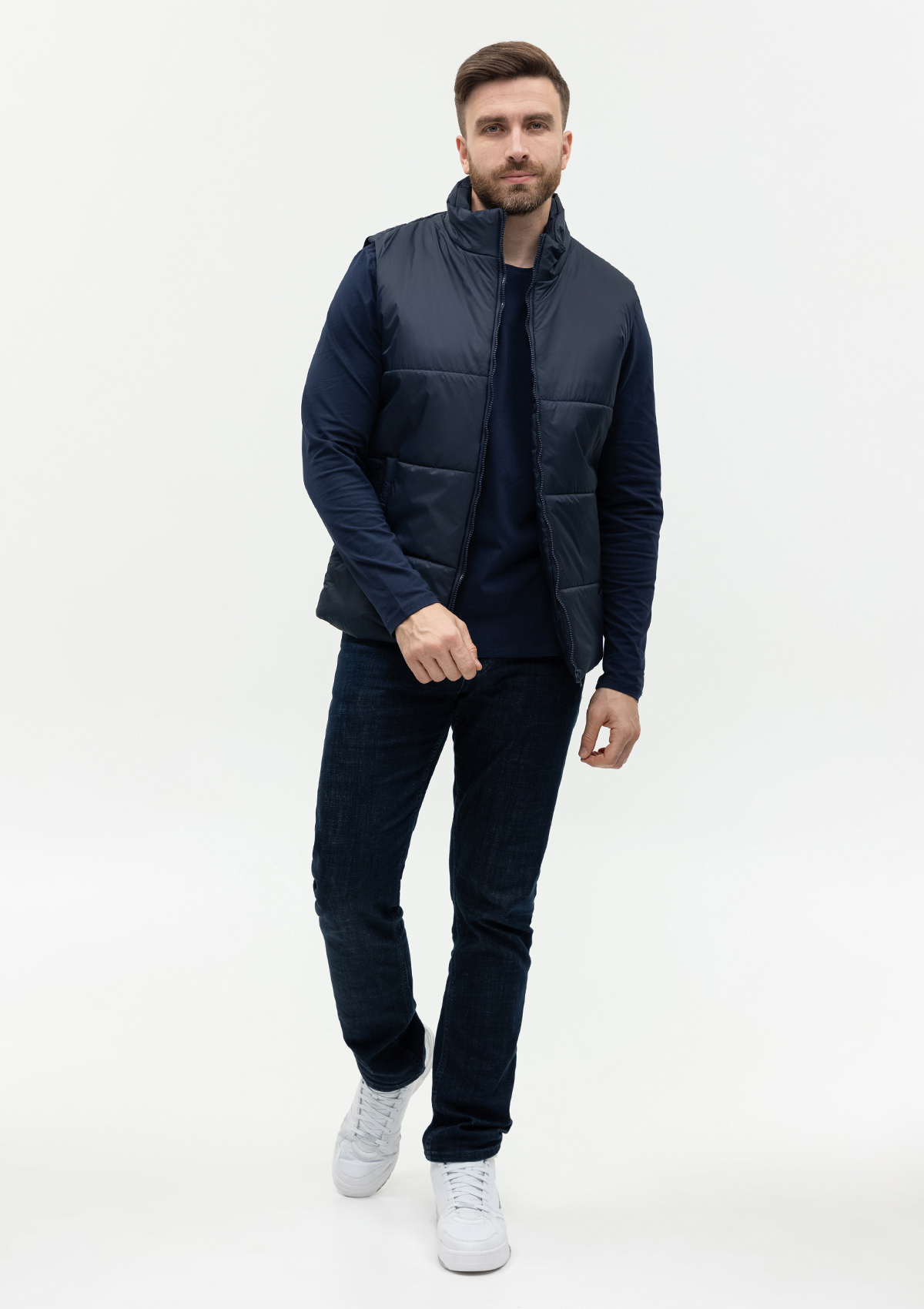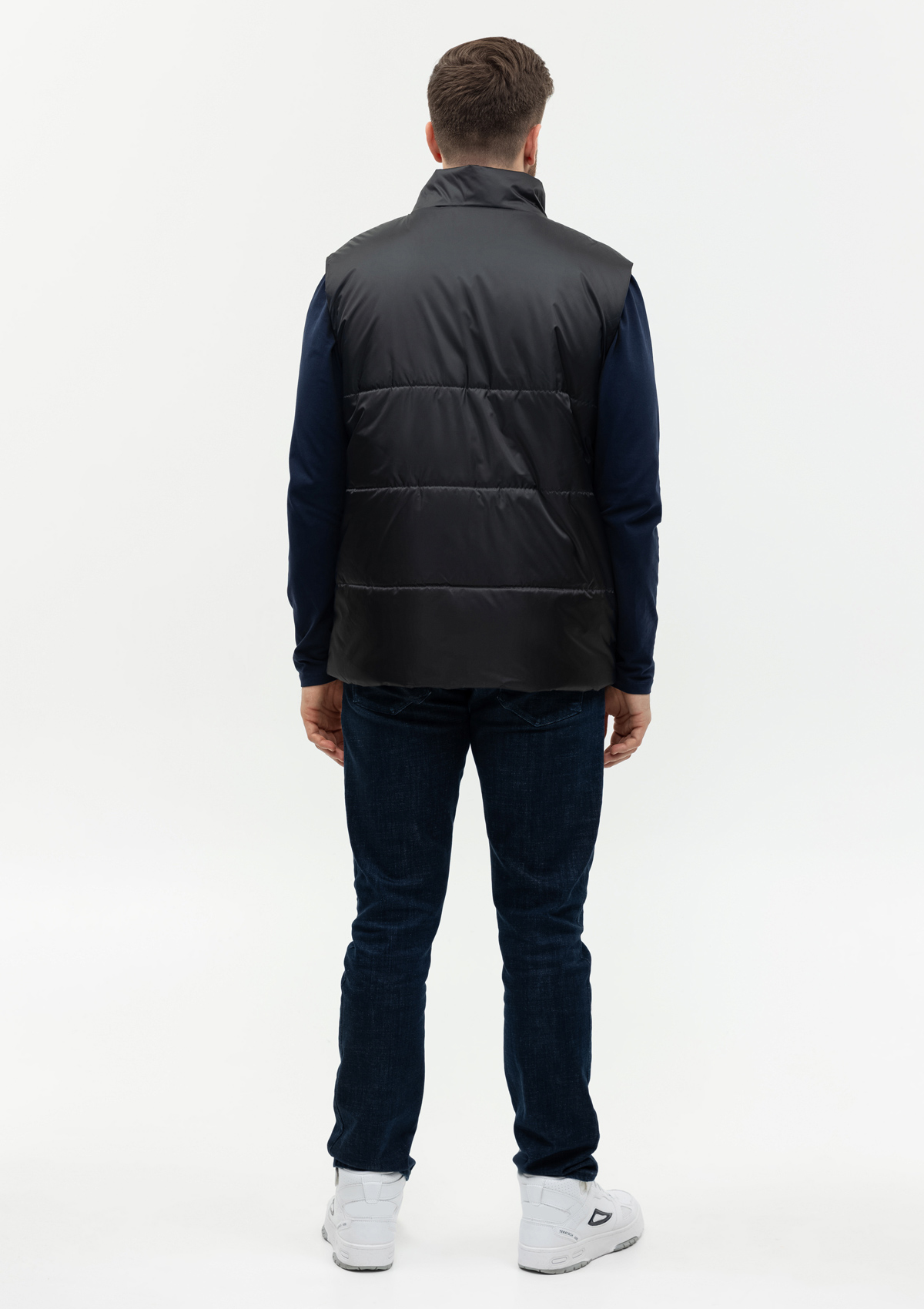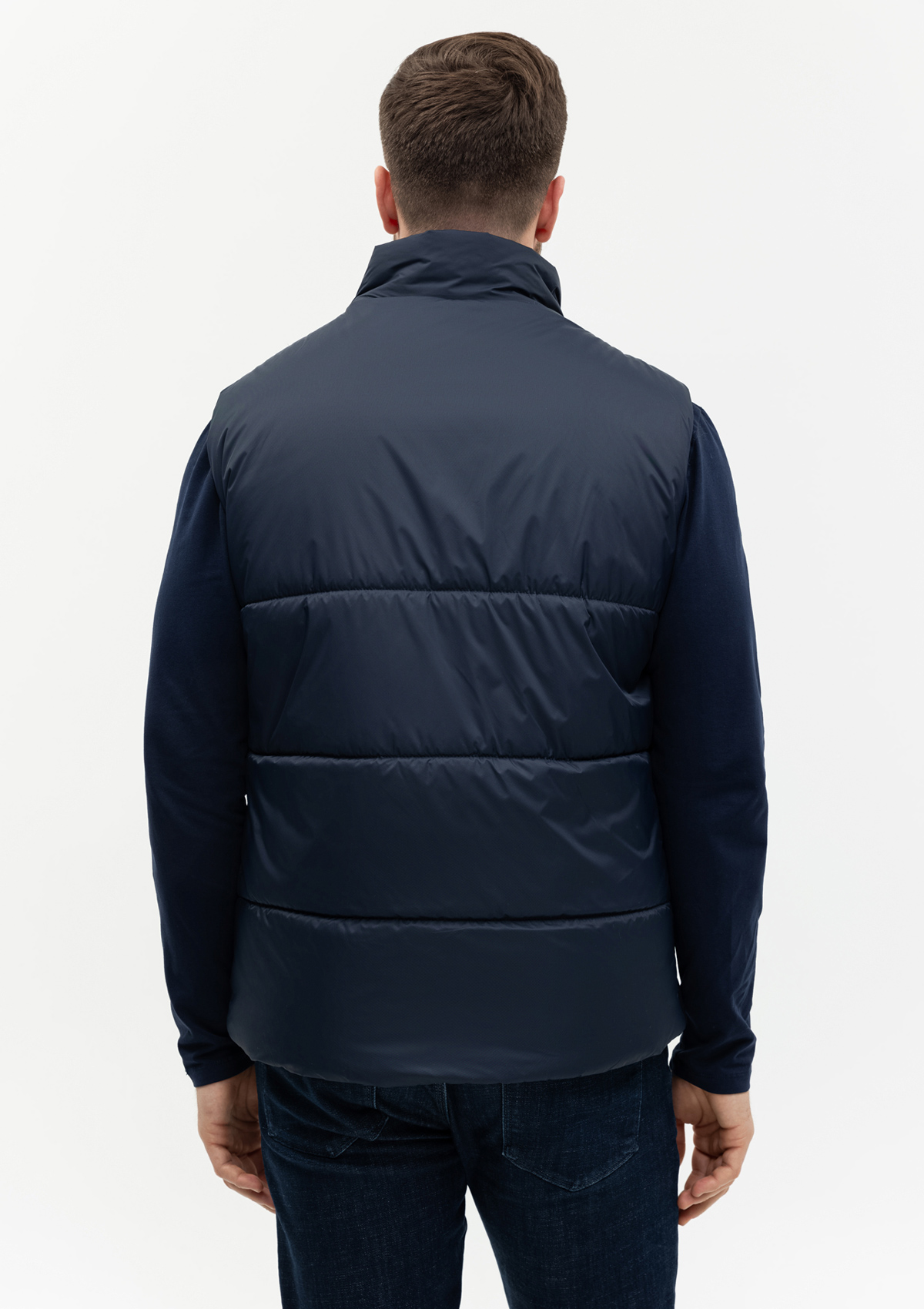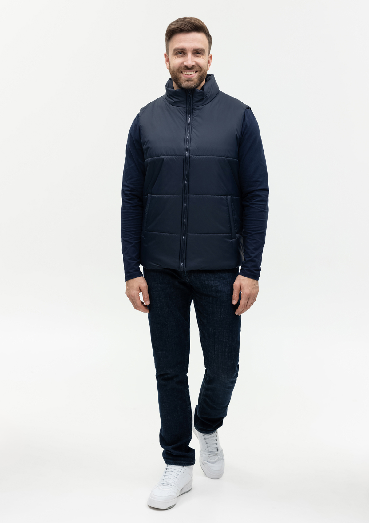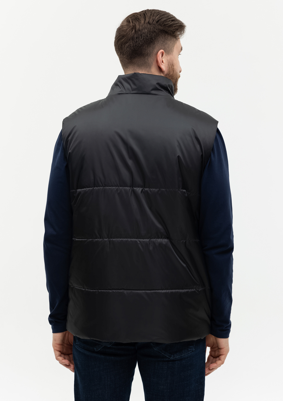 Универсальный жилет прямого силуэта с широкой горизонтальной стежкой, высоким воротником-стойкой, глубоким прорезным карманом и застежкой на молнию. Благодаря классическому лаконичному крою модель станет стильным дополнением как к мужскому, так и к женскому гардеробу.