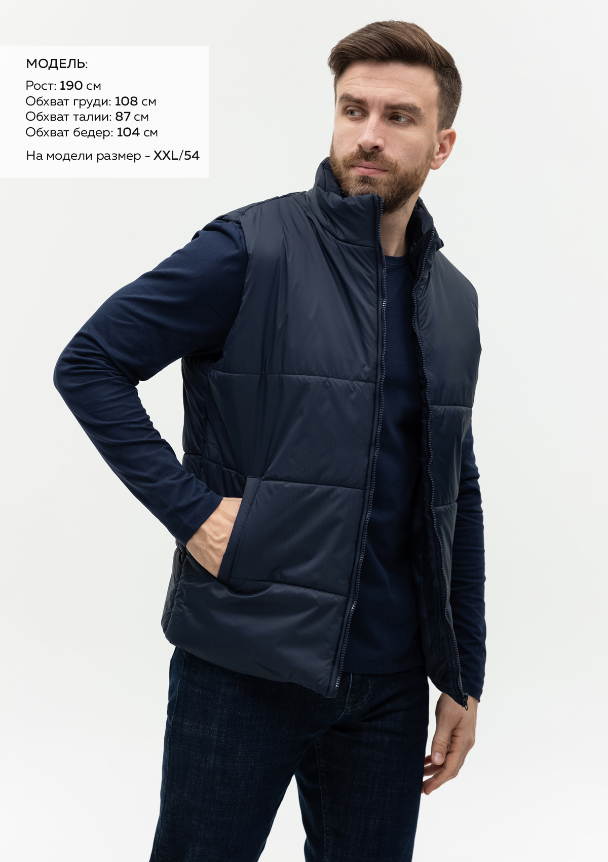 Размер мужского жилета: XXL/54. Параметры модели: рост 190 см.; обхват груди 108 см.; обхват талии 87 см.; обхват бедер 104 см.