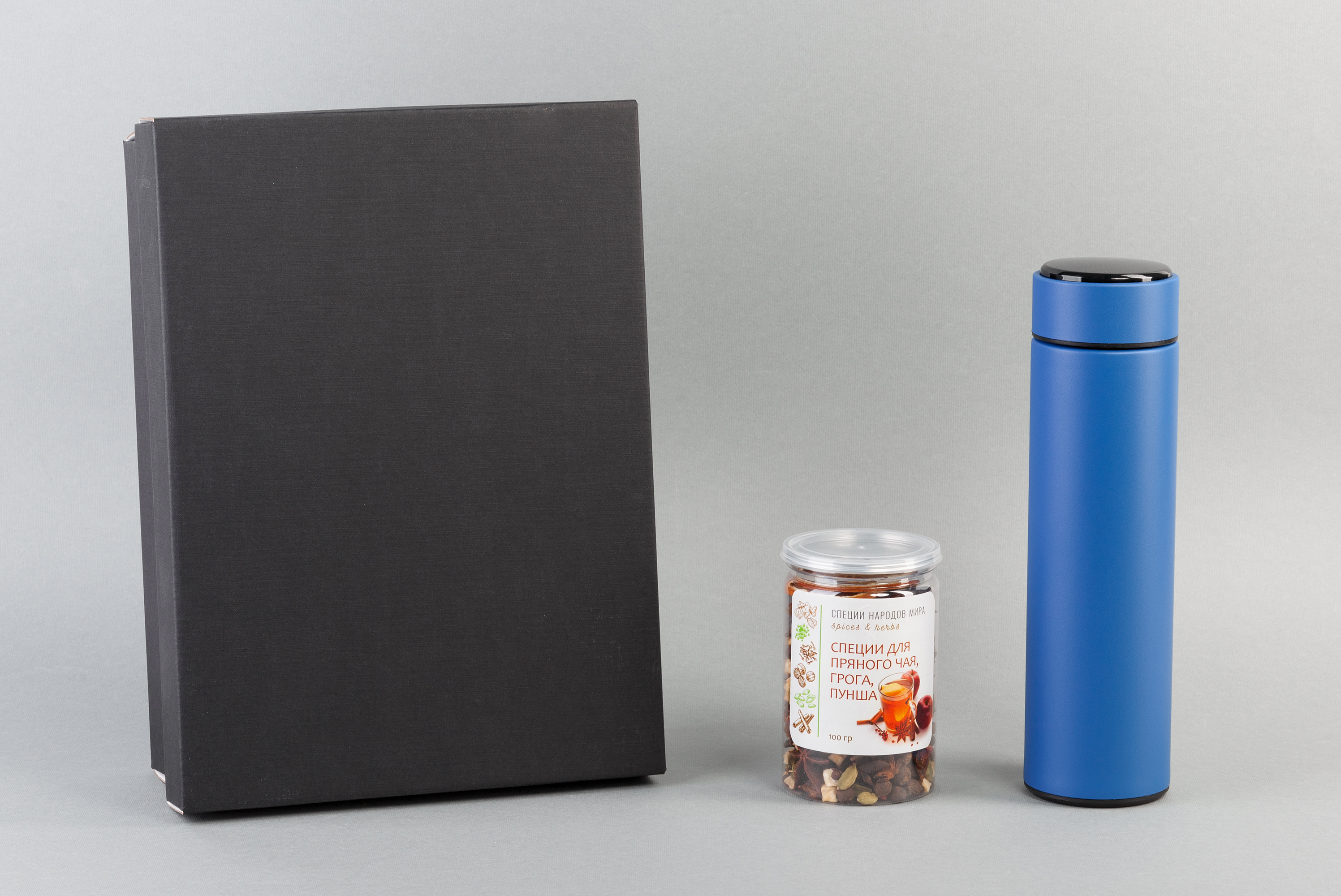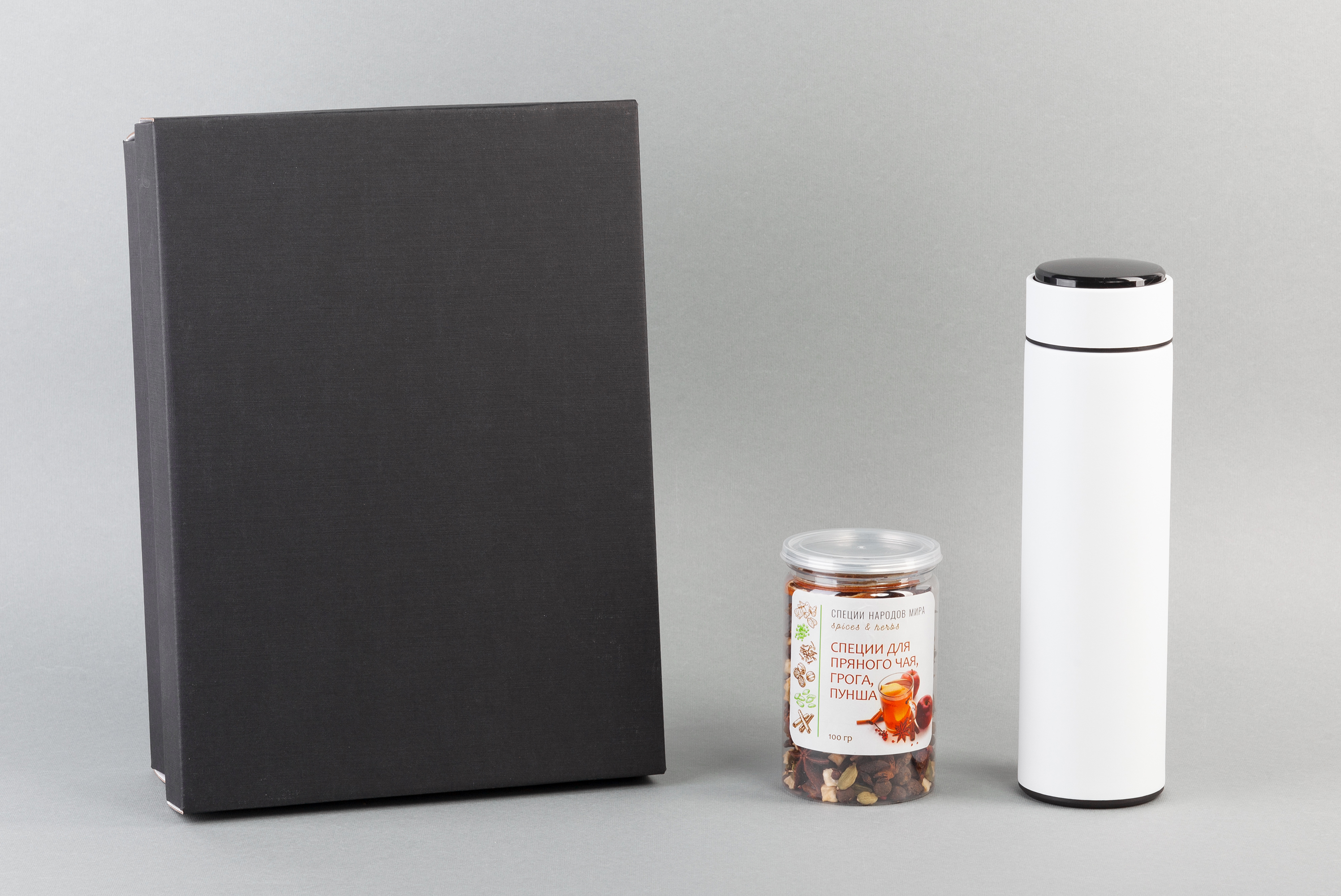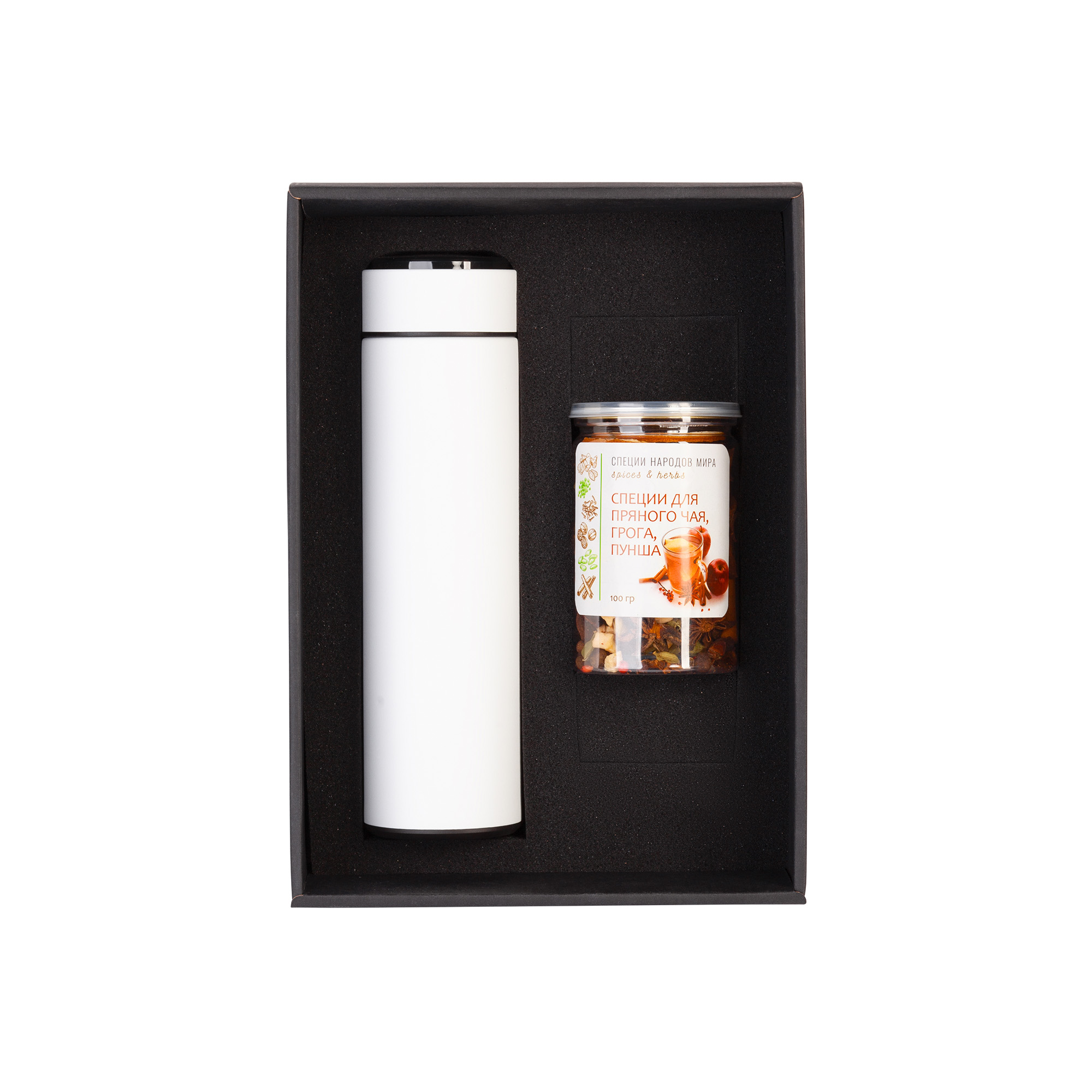 в набор входит: термос "Финикс" 500 мл (11-6394); h 23,6 х d 6,5 см; специи для глинтвейна, пряного чая, пунша, грога 100 гр (3 порции: палочки корицы, бадьян, гвоздика, кардамон, изюм, яблоки сушеные, перец душистый, апельсины сушеные кольцами, перец розовый); h 11 х d 7 см; подарочная  коробка 20,5 x h 9 х 28,5 см.