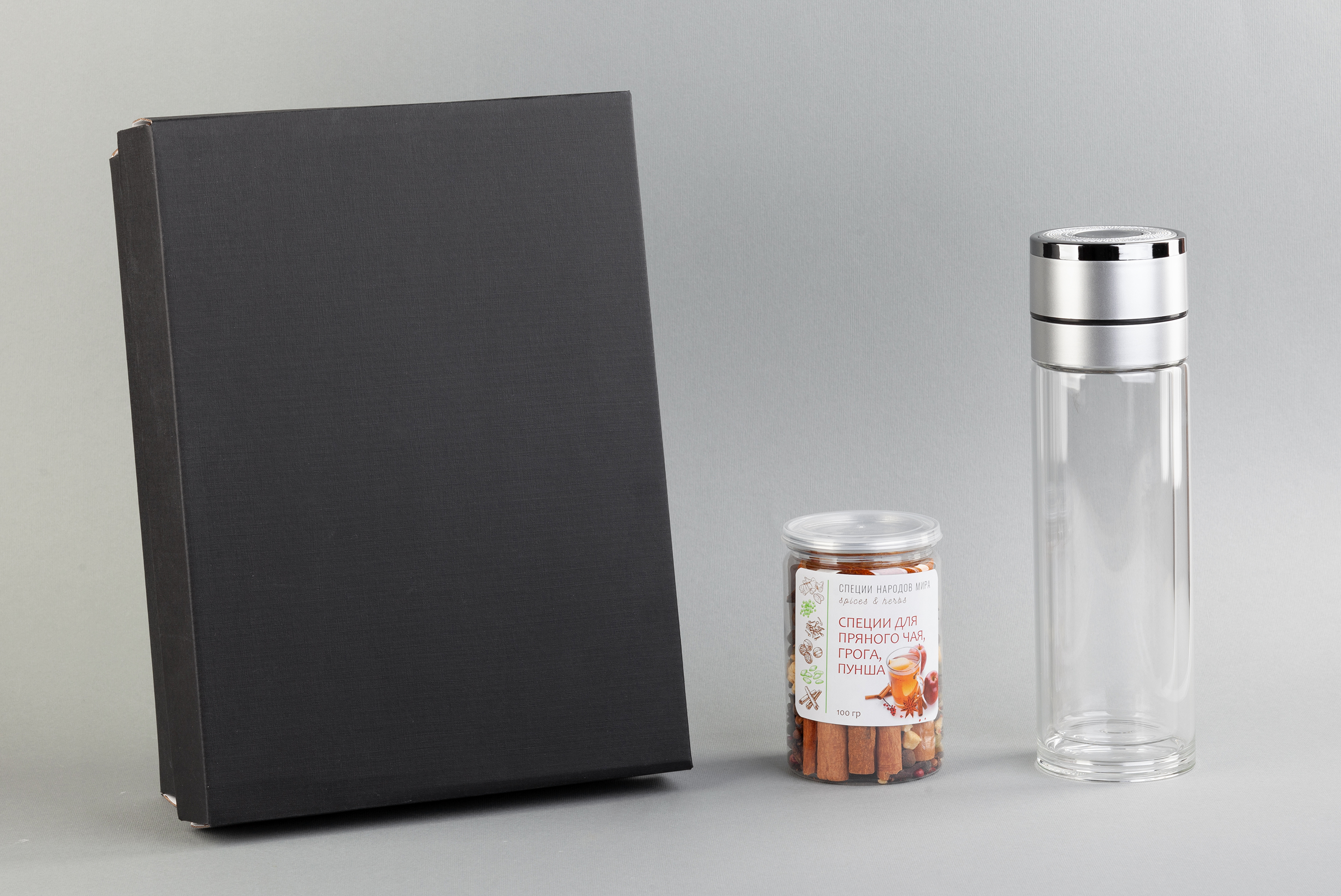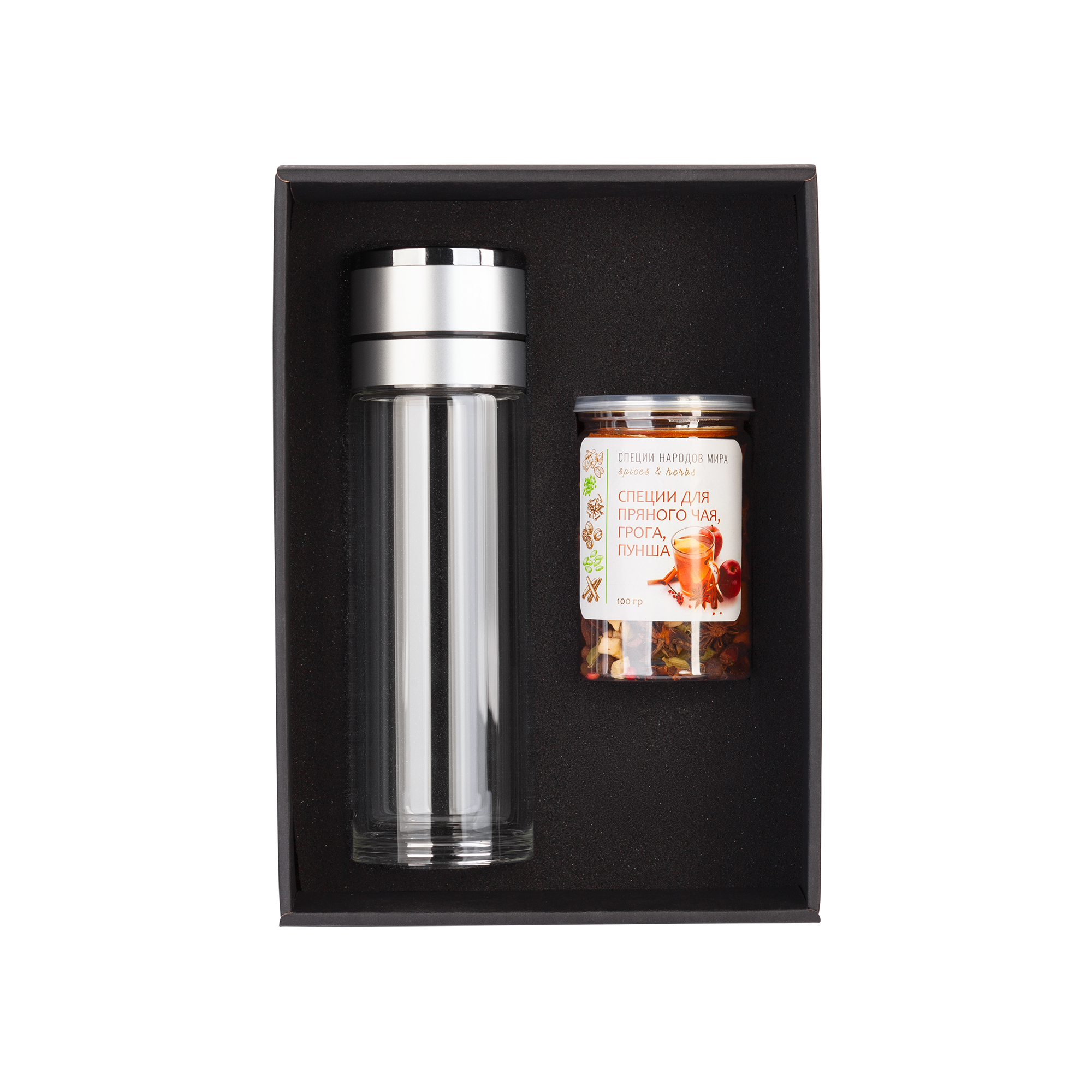 в набор входит: термос "Press" 400 мл (11-5439); h 24 х d 7 см; специи для глинтвейна, пряного чая, пунша, грога 100 гр (3 порции: палочки корицы, бадьян, гвоздика, кардамон, изюм, яблоки сушеные, перец душистый, апельсины сушеные кольцами, перец розовый); h 11 х d 7 см; подарочная  коробка 20,5 x h 9 х 28,5 см.