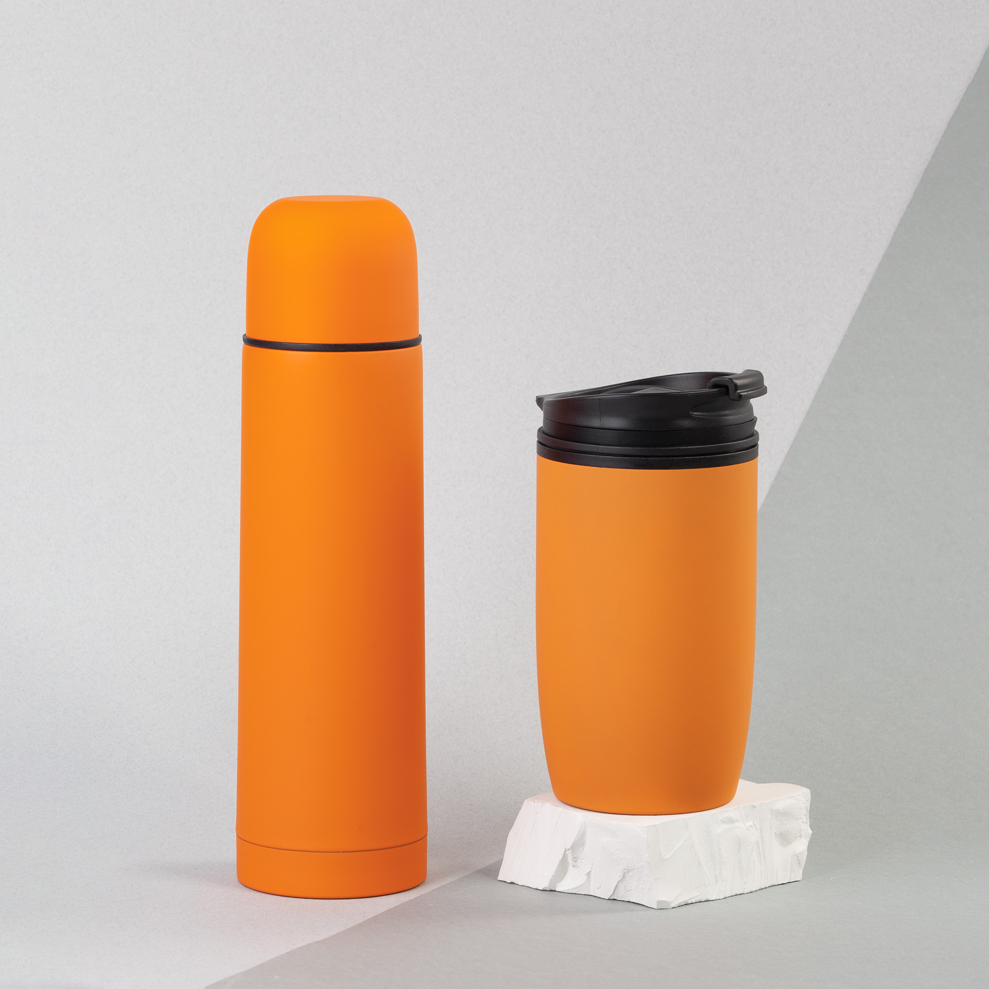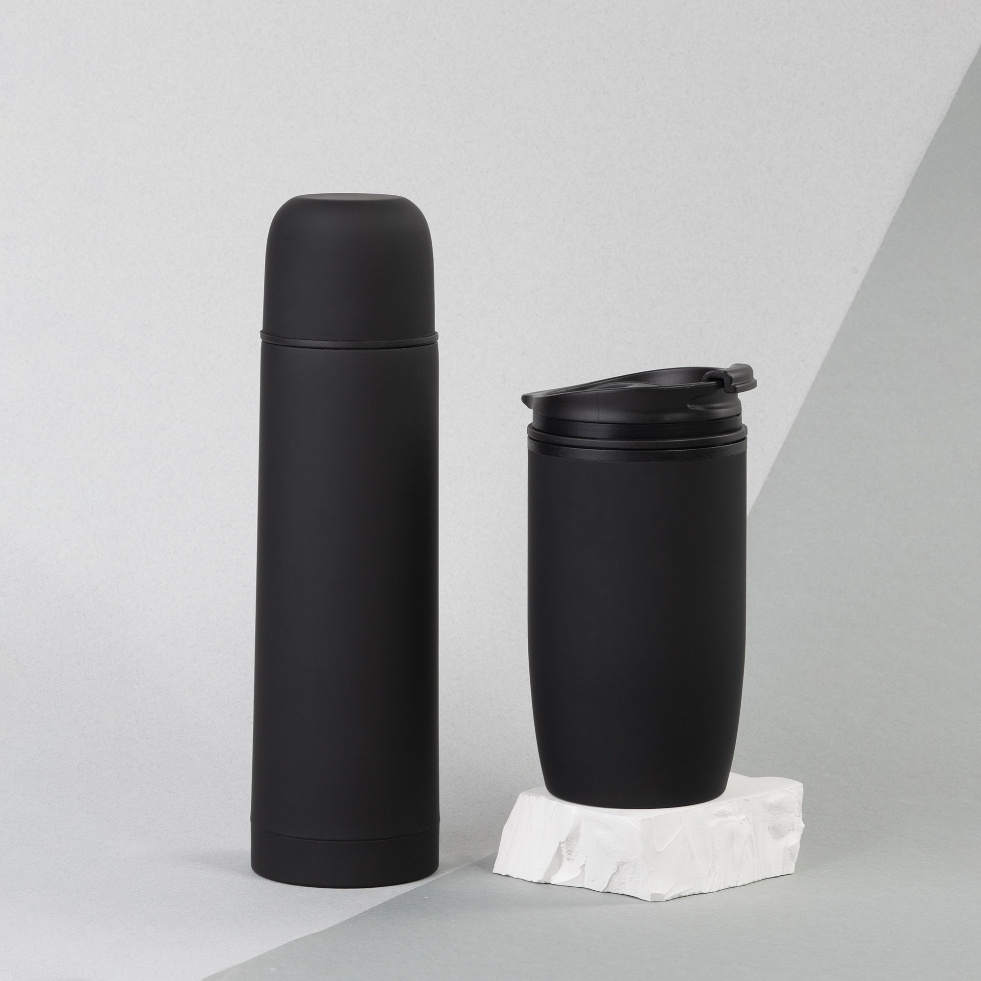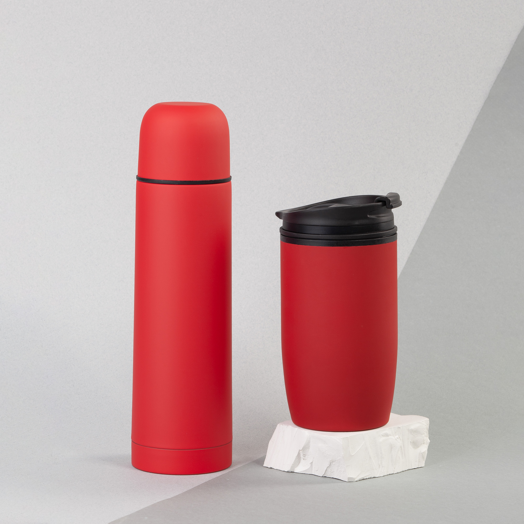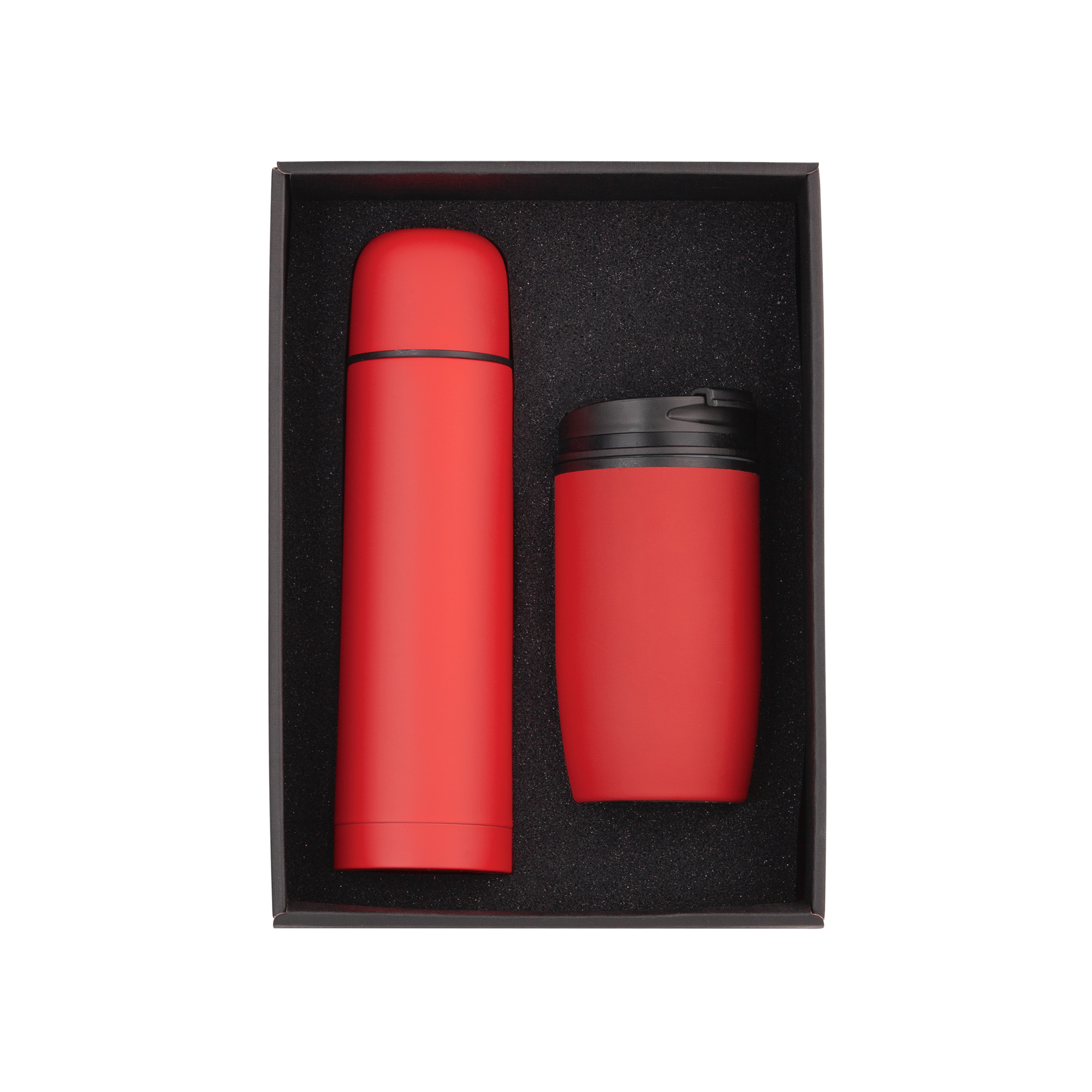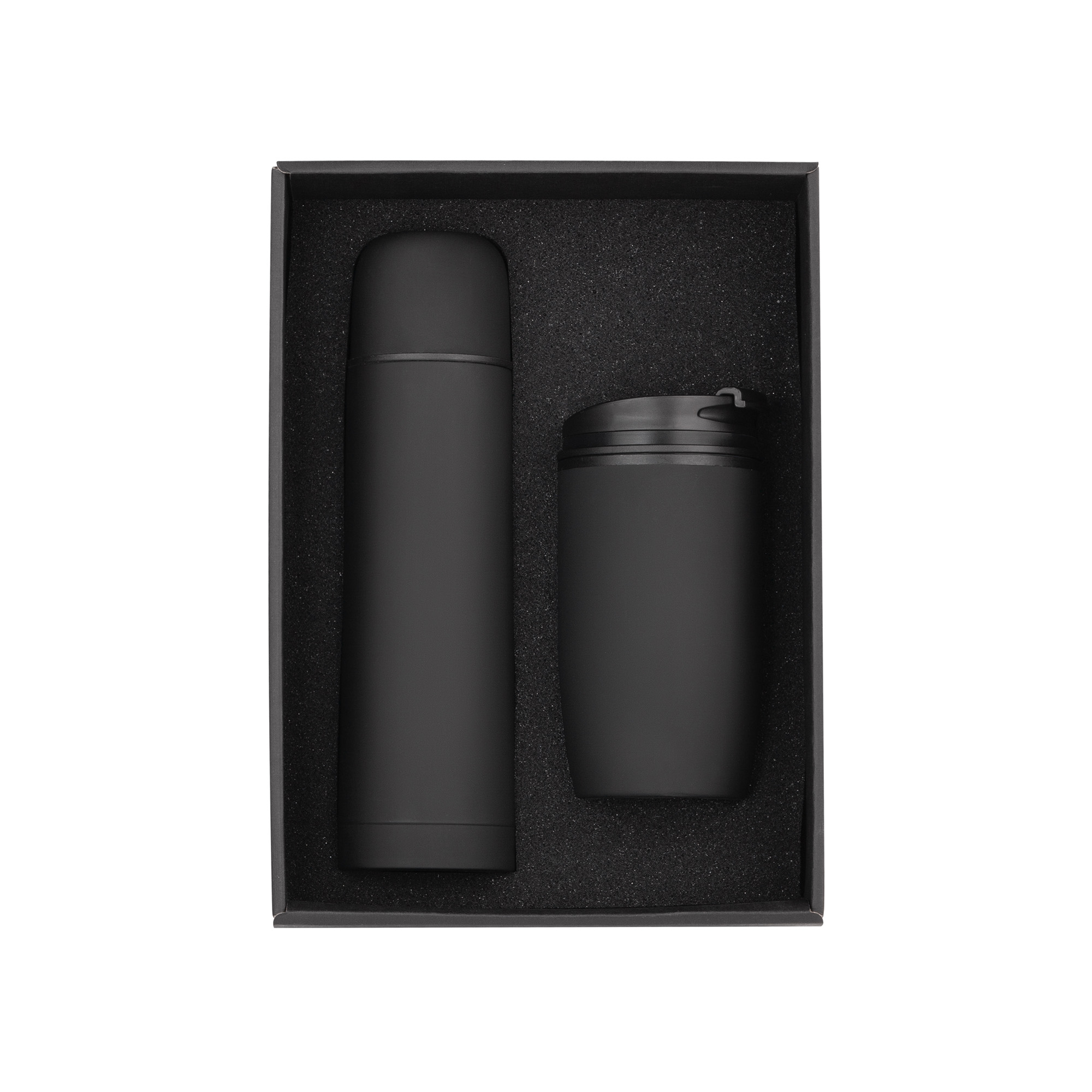 В набор входят:  11-6330 термос "Крит" 500 мл в покрытии soft touch, размер h 25 х d 7 см; 11-6395 термостакан "Unicup" 300 мл в покрытии soft touch, размер h 15,7 х d 8 см;  коробка подарочная с ложементом 20,5 x h 9 х 28,5 см