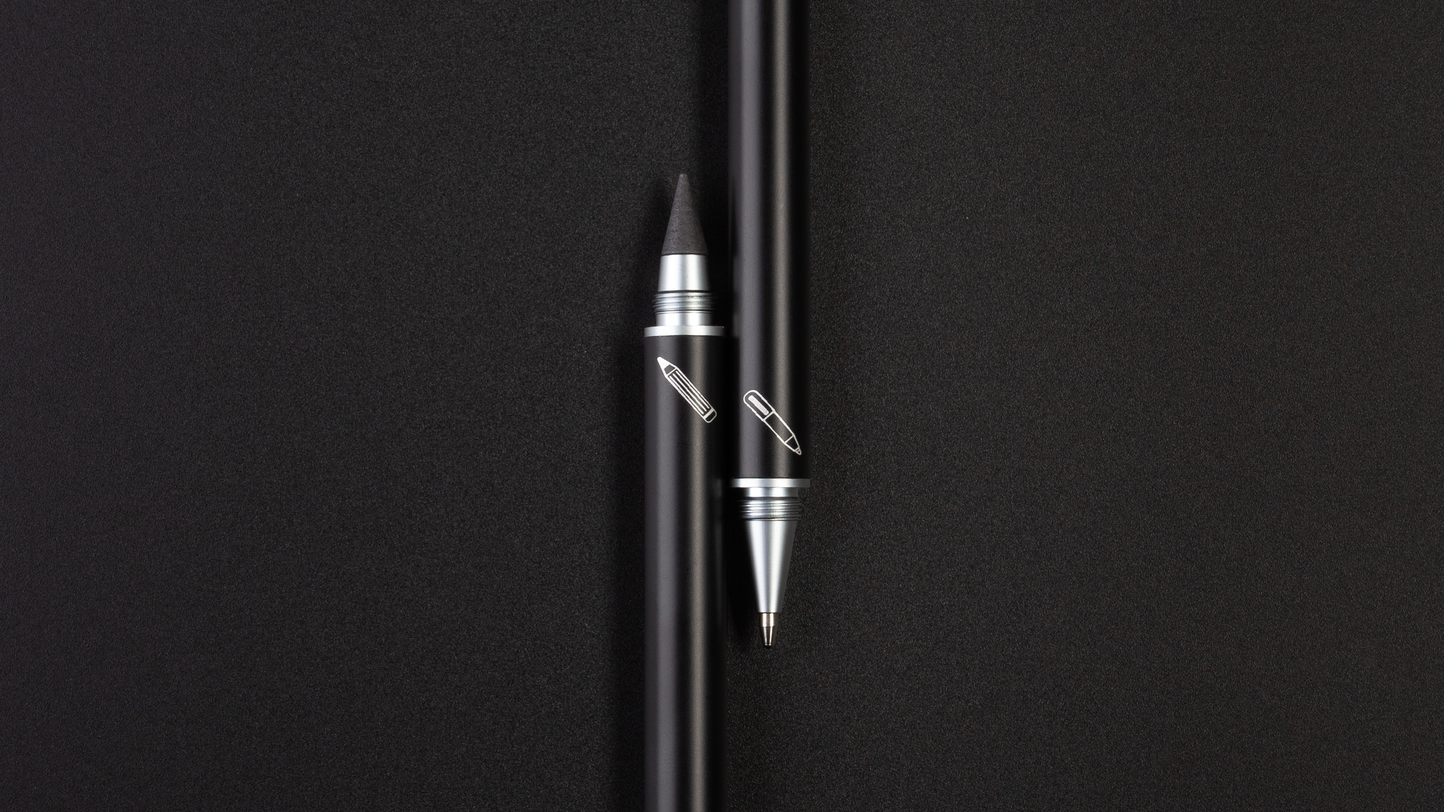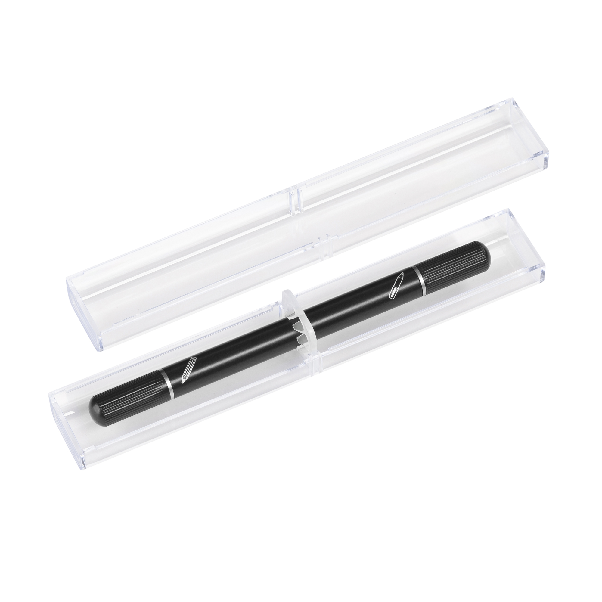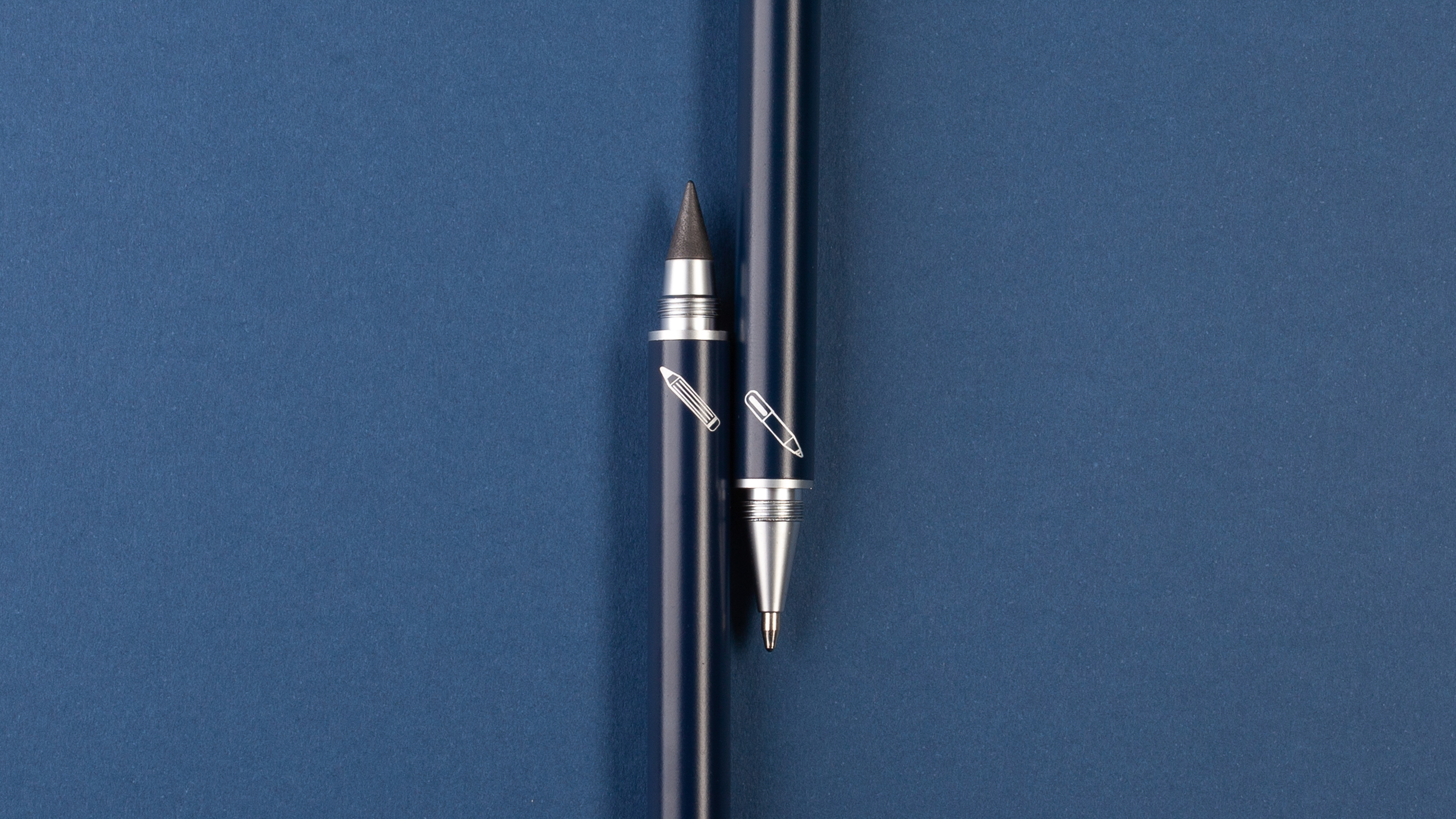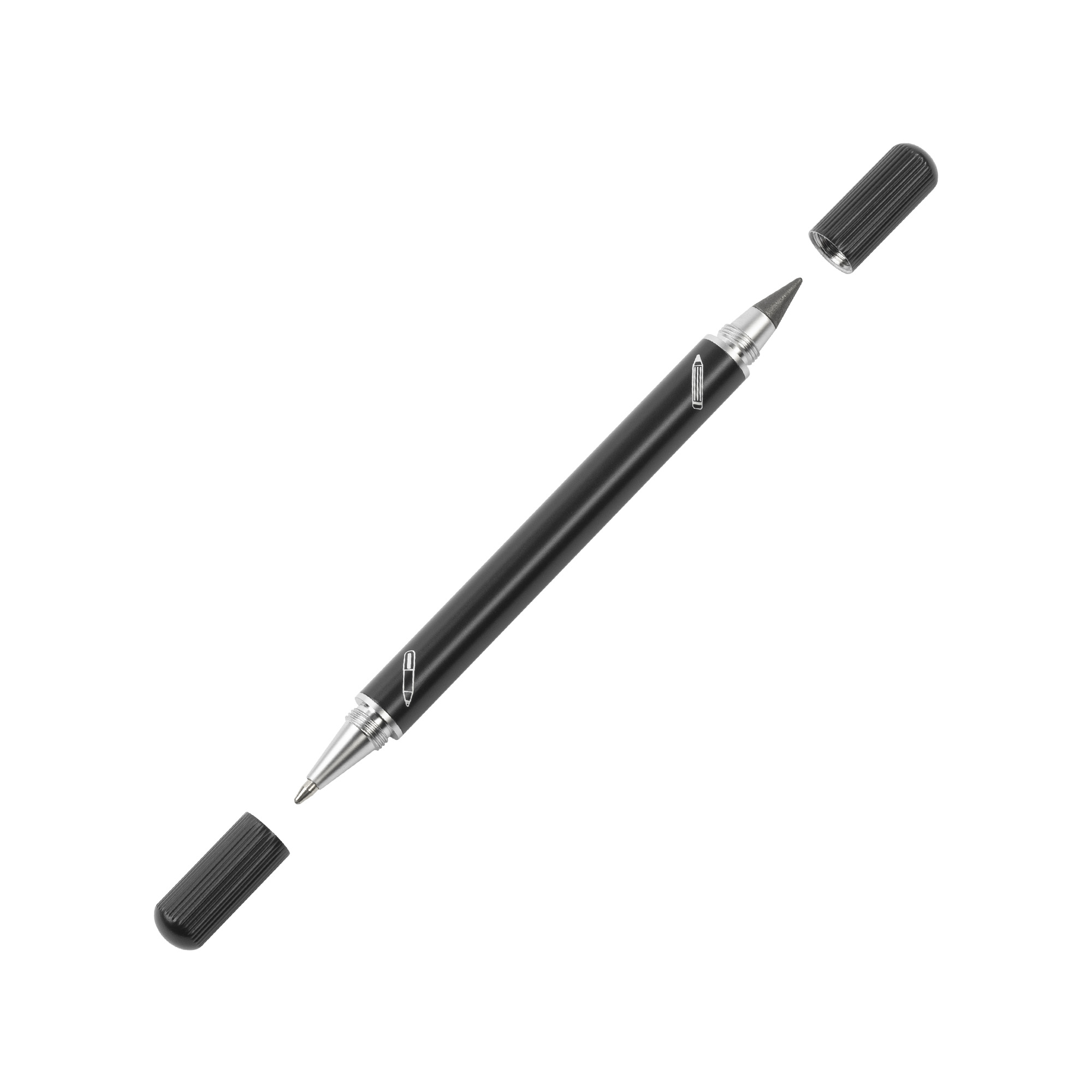 Набор из 2х письменных принадлежностей в едином корпусе - шариковой ручки и вечного карандаша, грифель которого выполнен из сверхпрочного графита с длиной письма до 30 000 метров, Закручивающиеся колпачки надёжно сохраняют пишущие узлы от внешних воздействий.