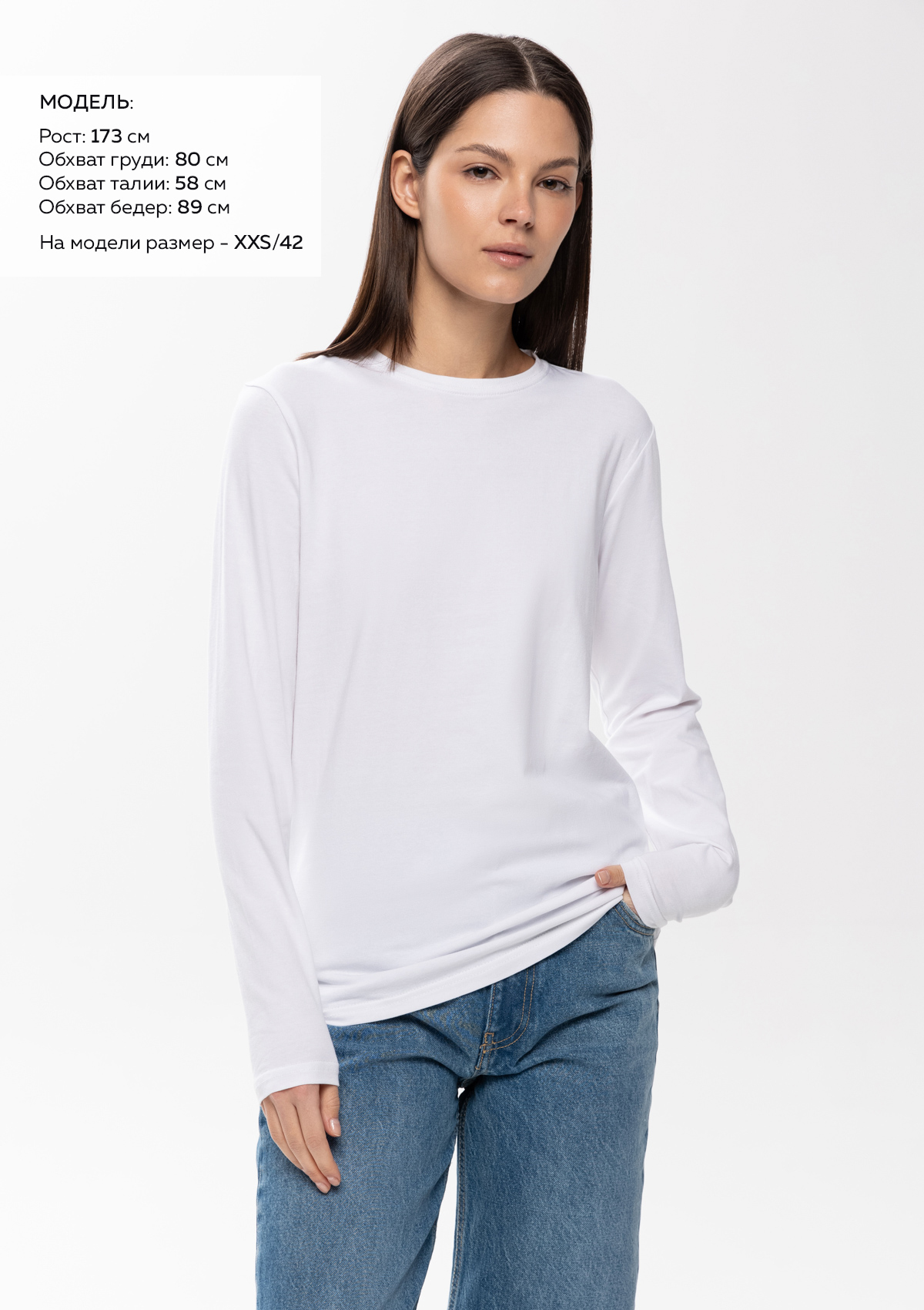 Универсальная футболка прямого силуэта с округлым воротом и длинным втачным рукавом. Плечевые швы и шов горловины усилены настрочной бейкой из основного полотна.