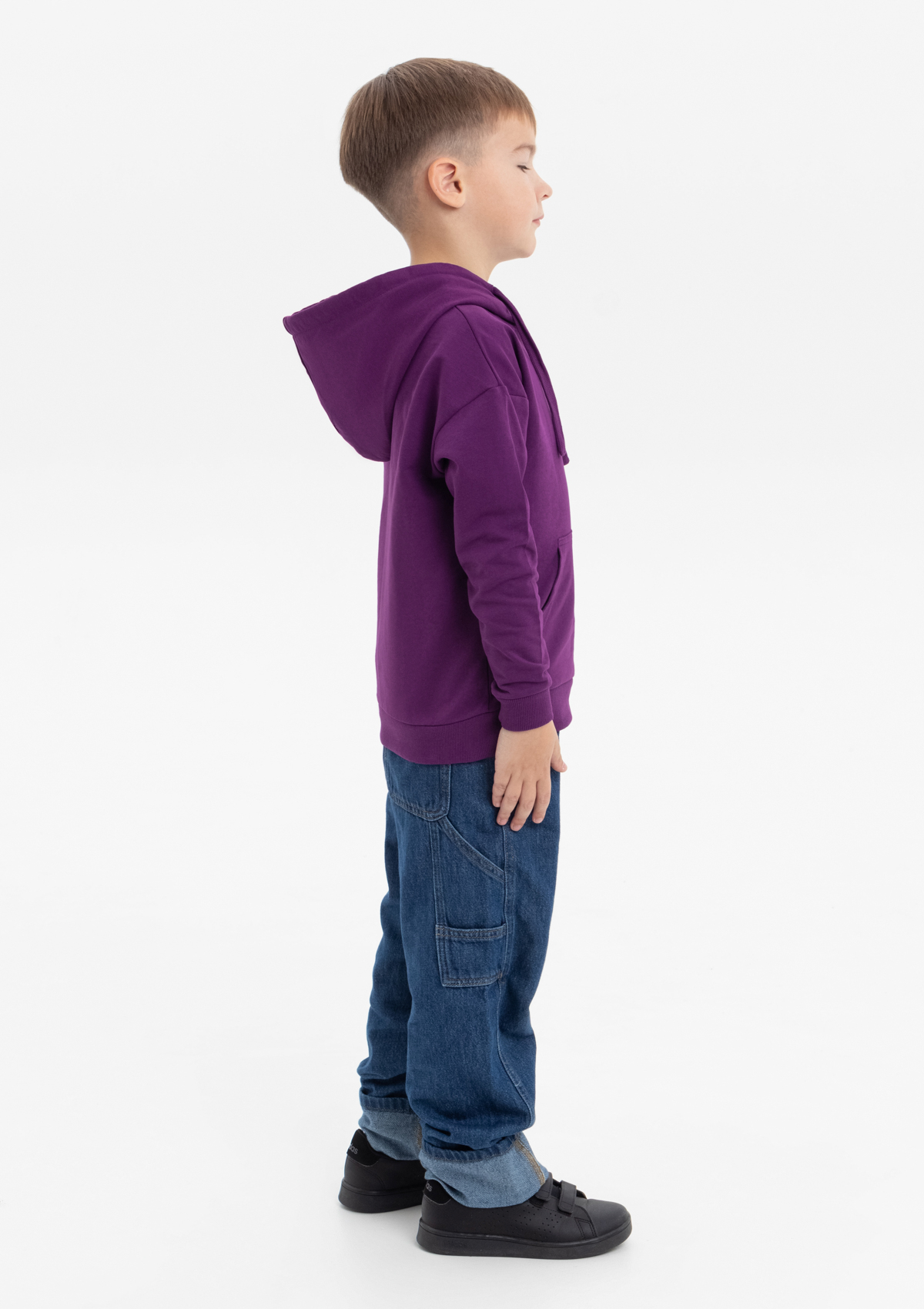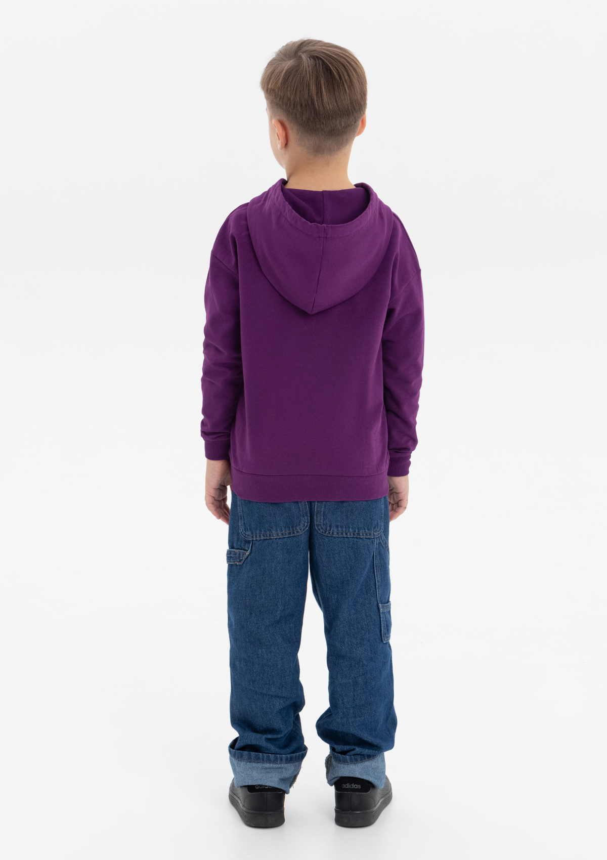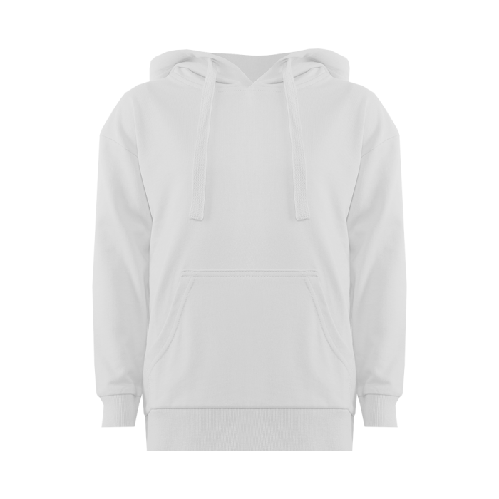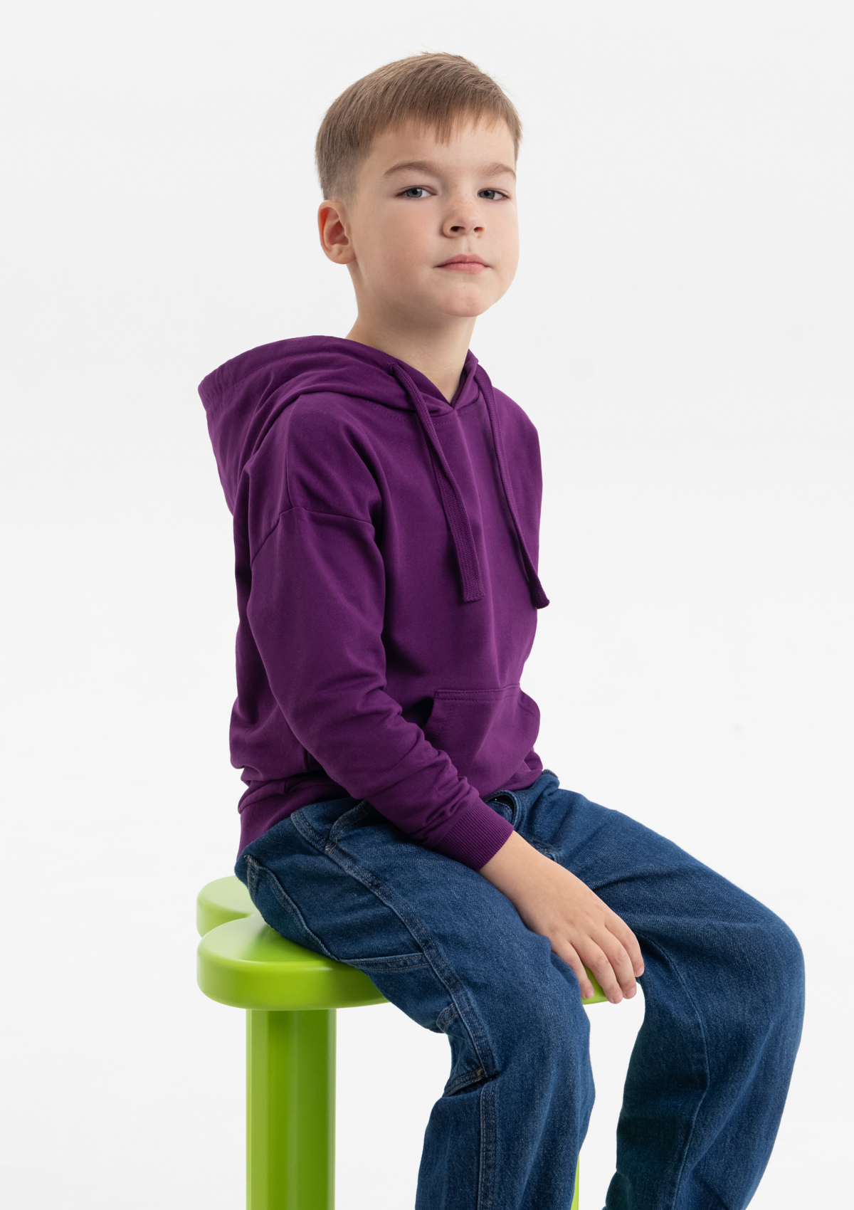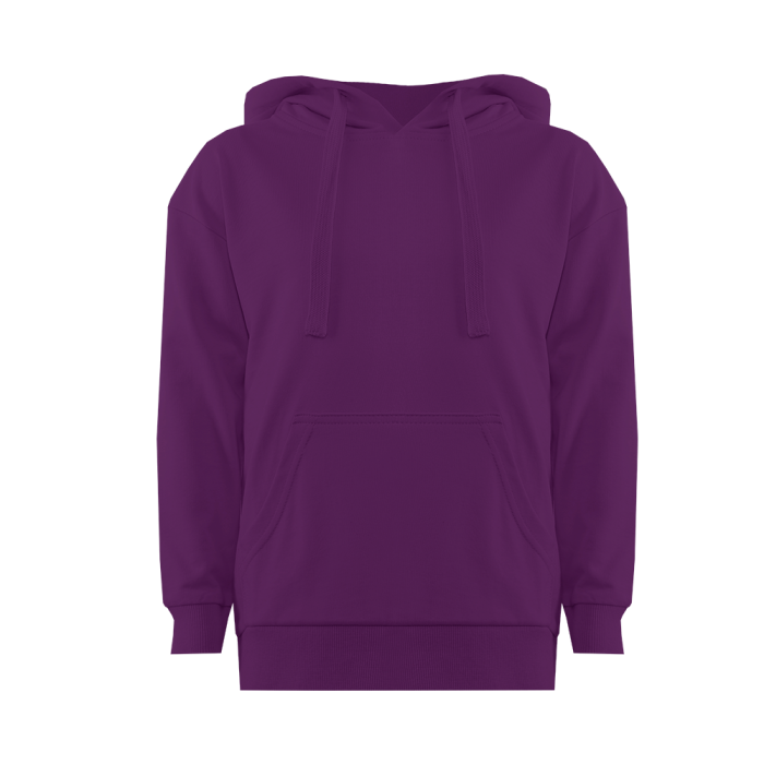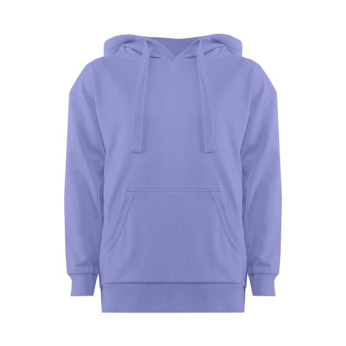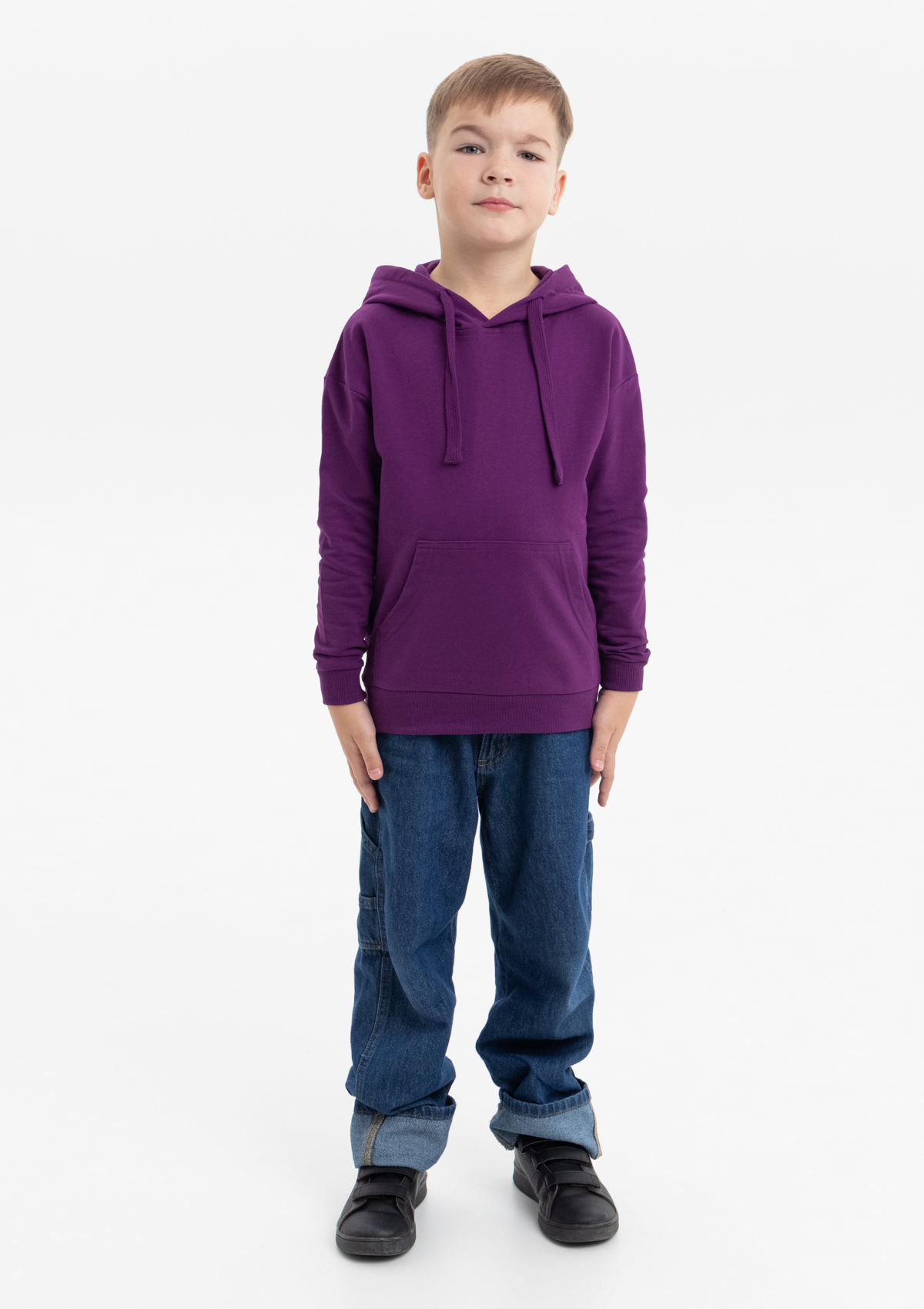 Модель прямого силуэта с капюшоном комфортной глубины, спущенной линией плеча и накладным карманом-кенгуру. Капюшон регулируется плоским шнуром, горловина спинки усилена киперной лентой. Манжет и низ изделия выполнены широкой эластичной резинкой в тон основному цвету.