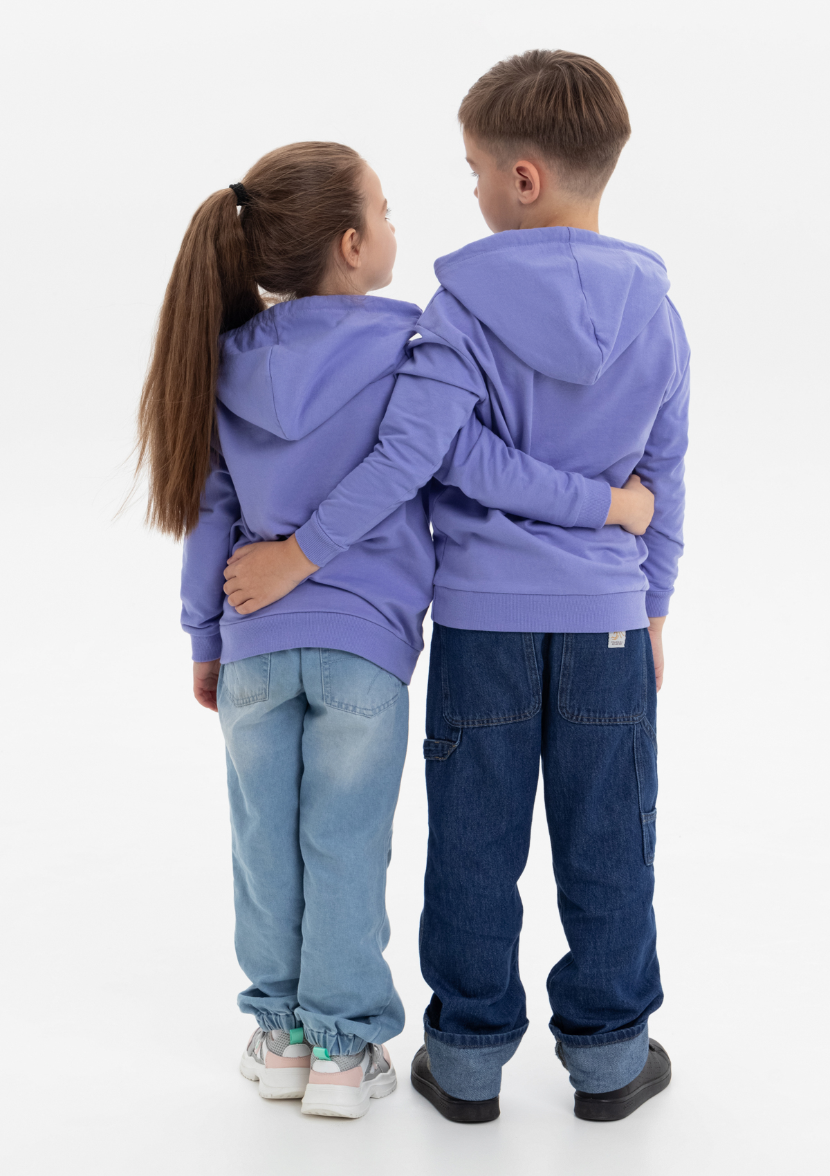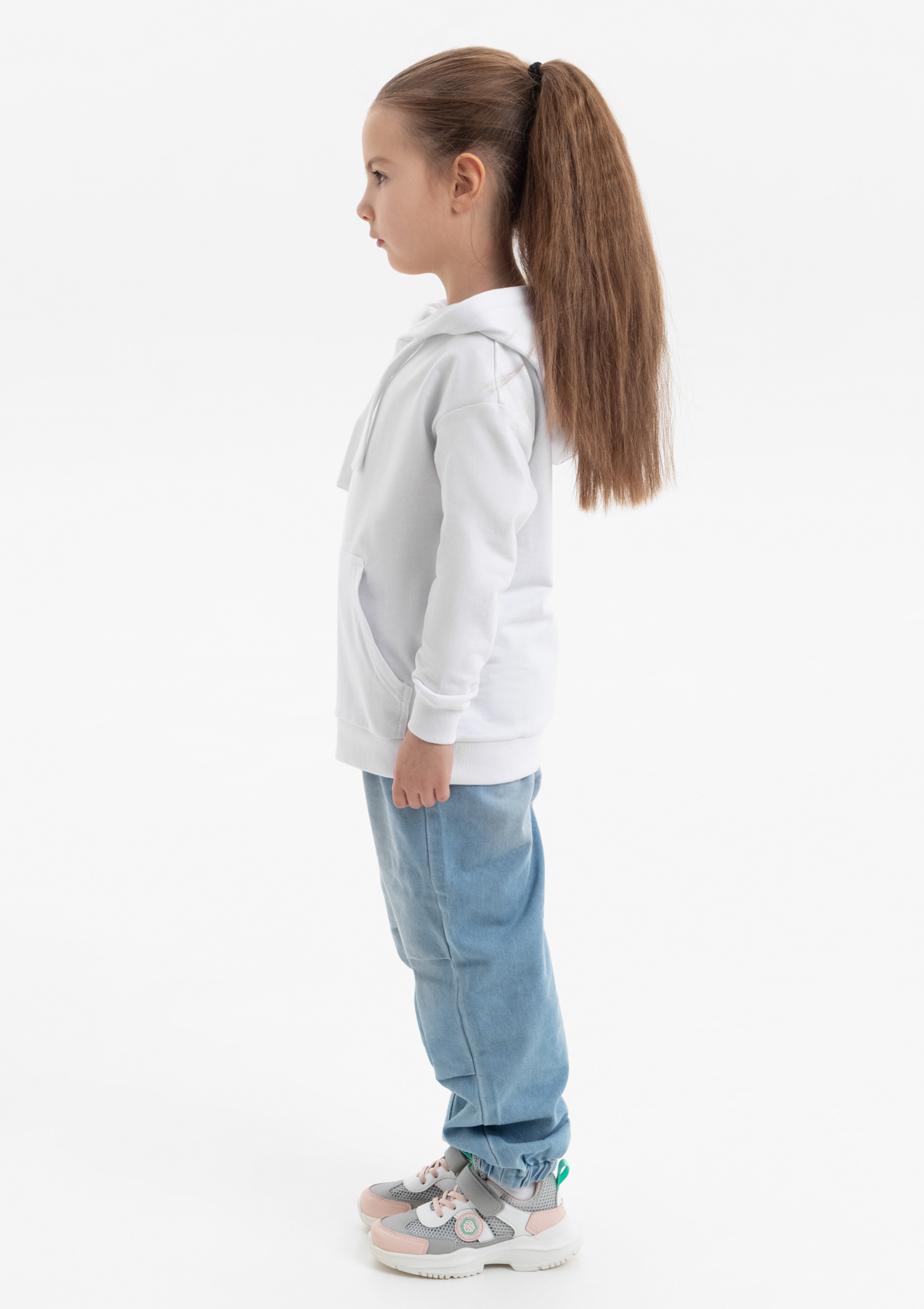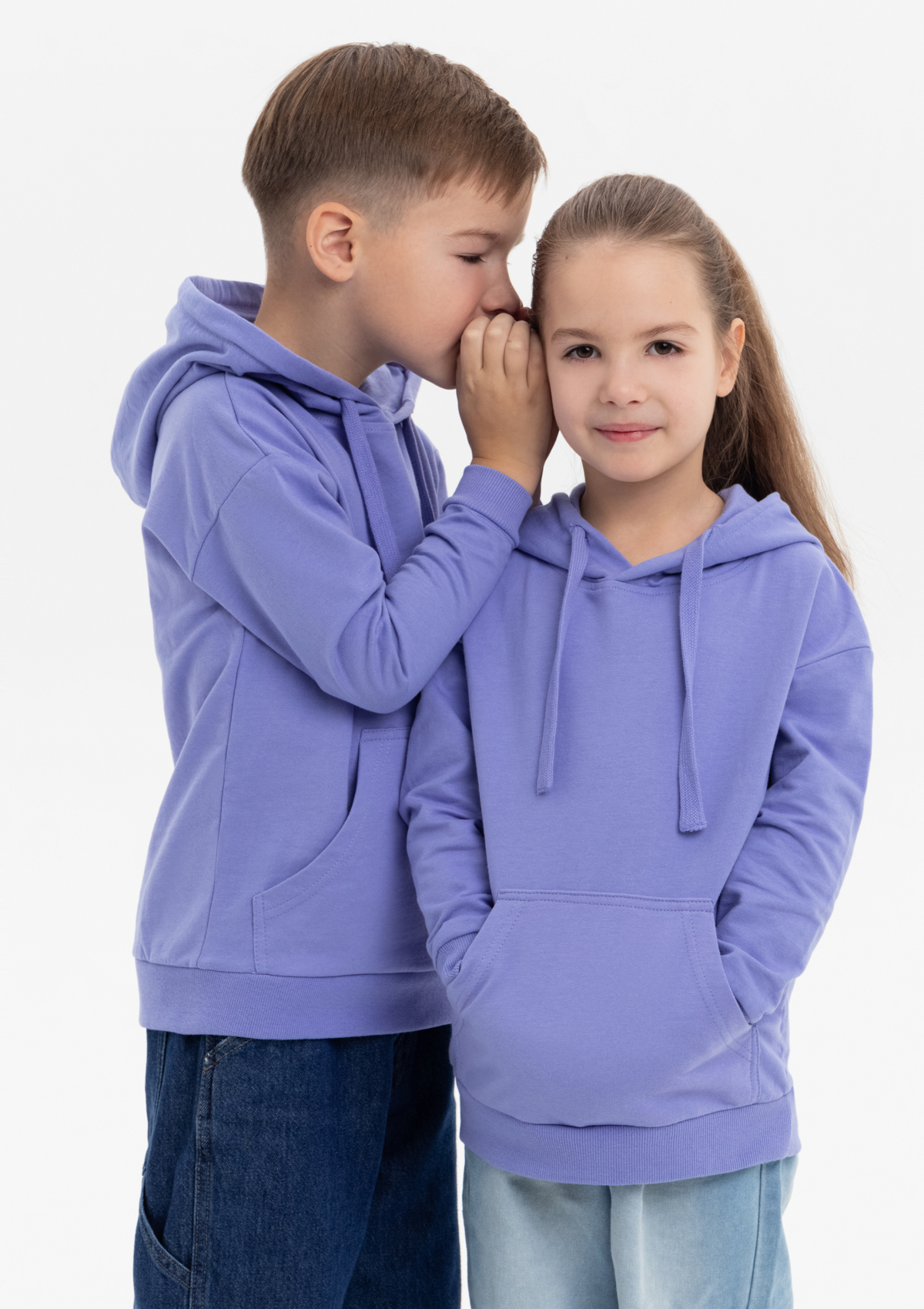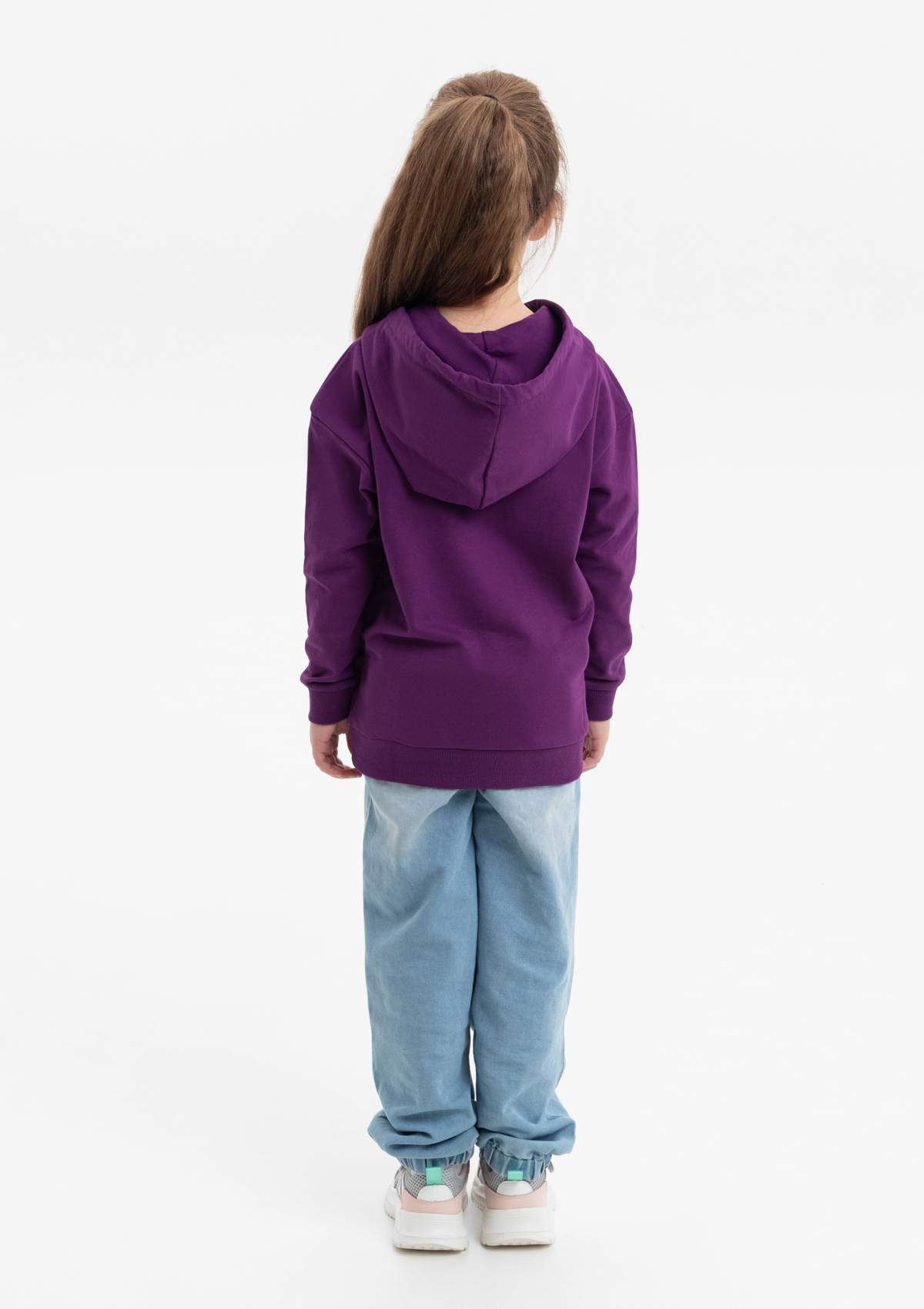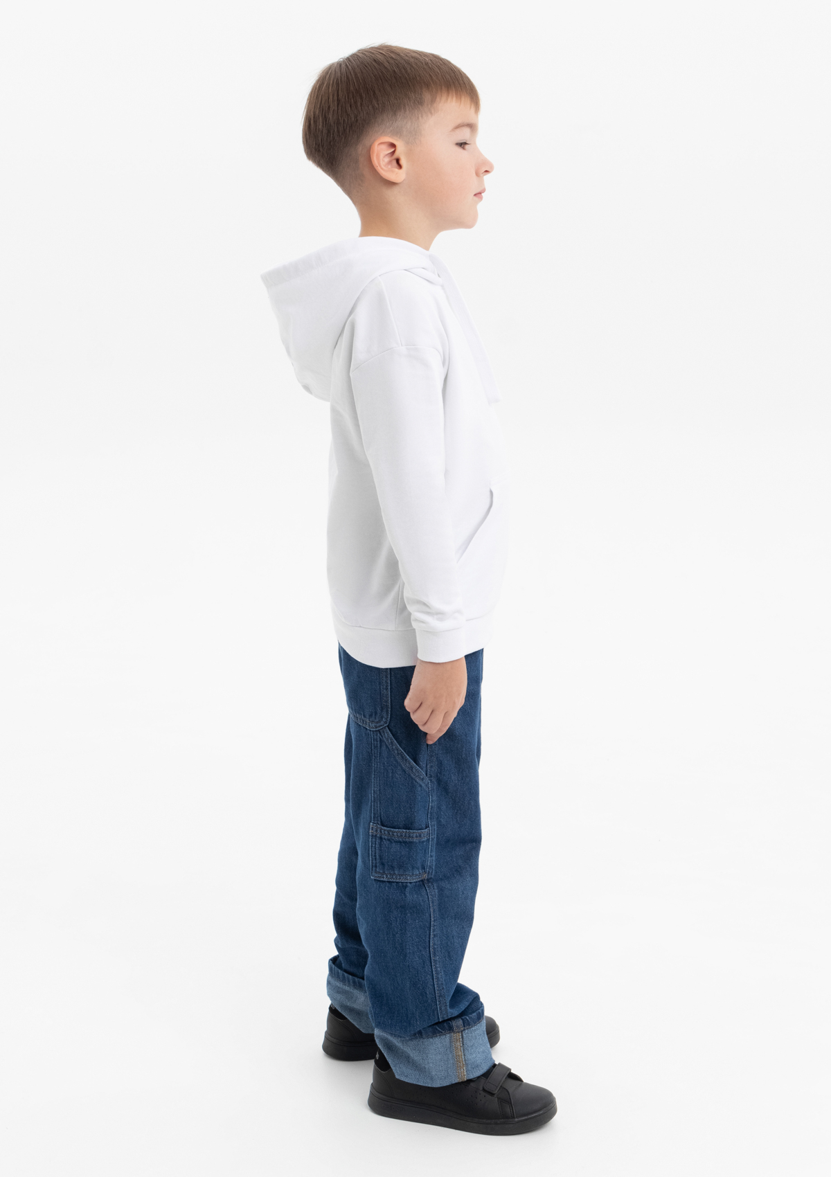 Модель прямого силуэта с капюшоном комфортной глубины, спущенной линией плеча и накладным карманом-кенгуру. Капюшон регулируется плоским шнуром, горловина спинки усилена киперной лентой. Манжет и низ изделия выполнены широкой эластичной резинкой в тон основному цвету.