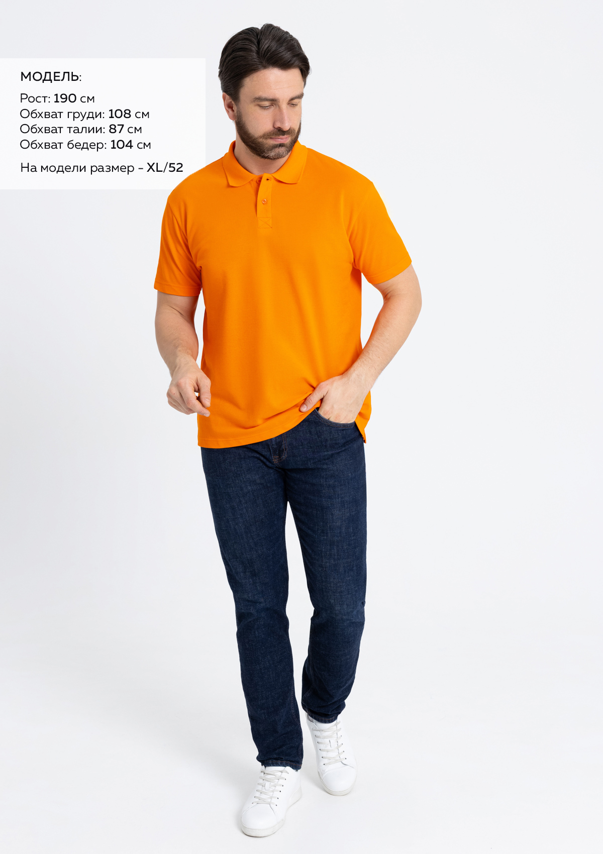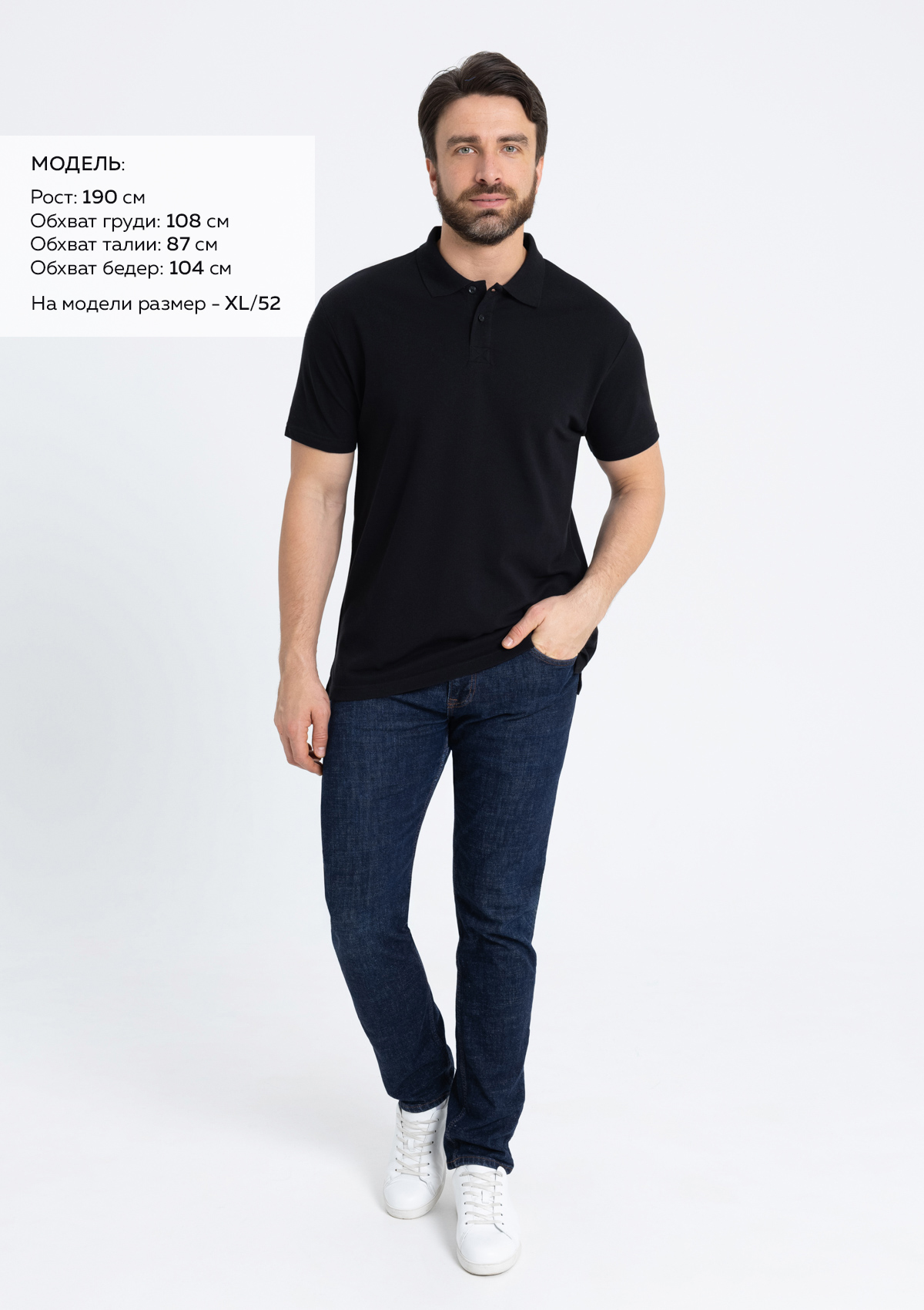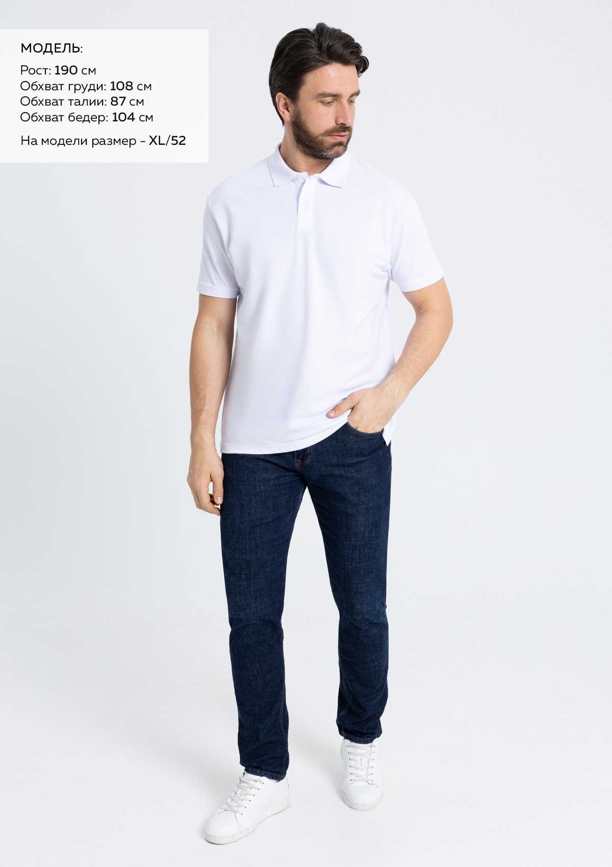 Размер на модели: XL/52. Параметры модели: рост 190 см.; обхват груди 108 см.; обхват талии 87 см.; обхват бедер 104 см.