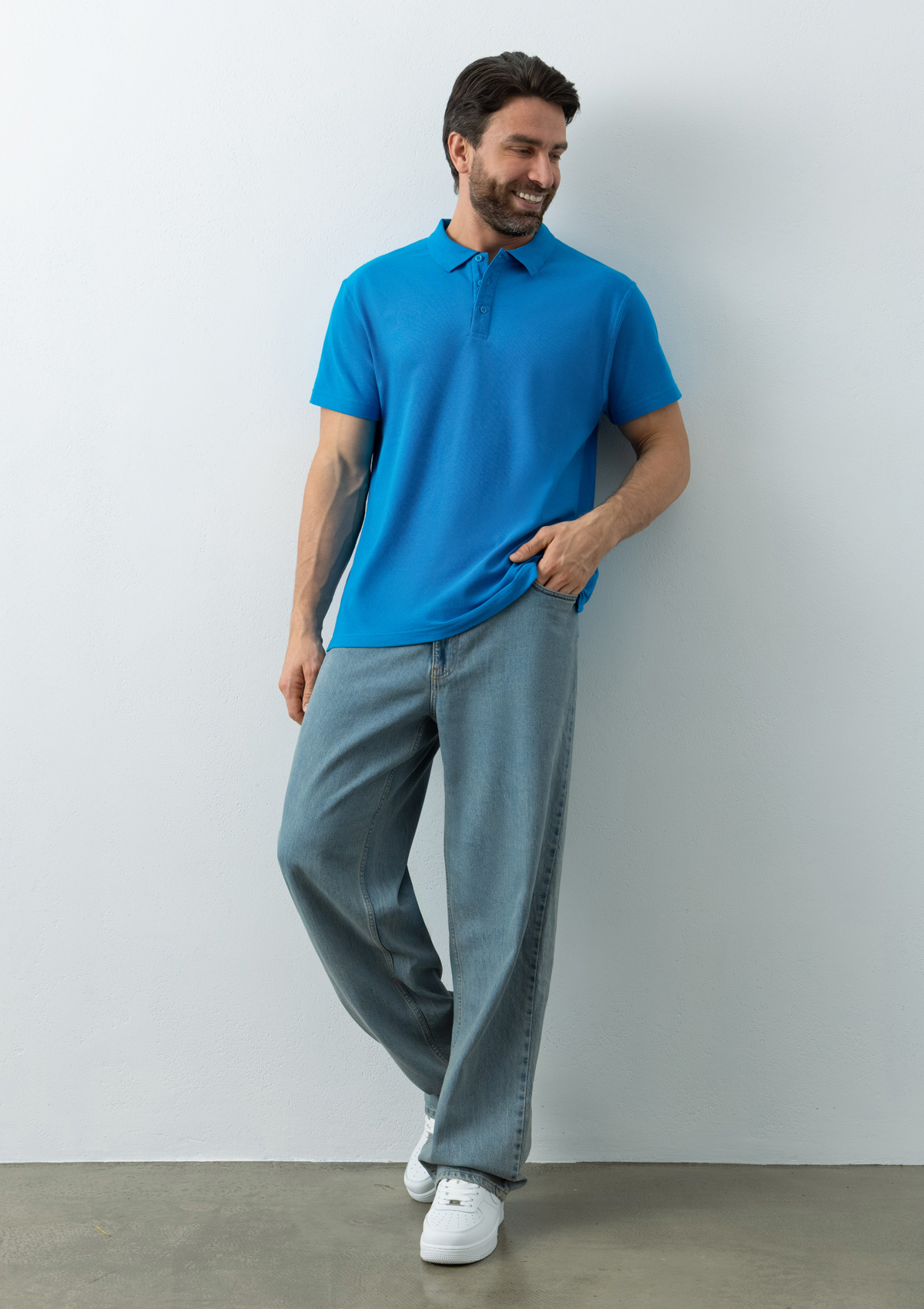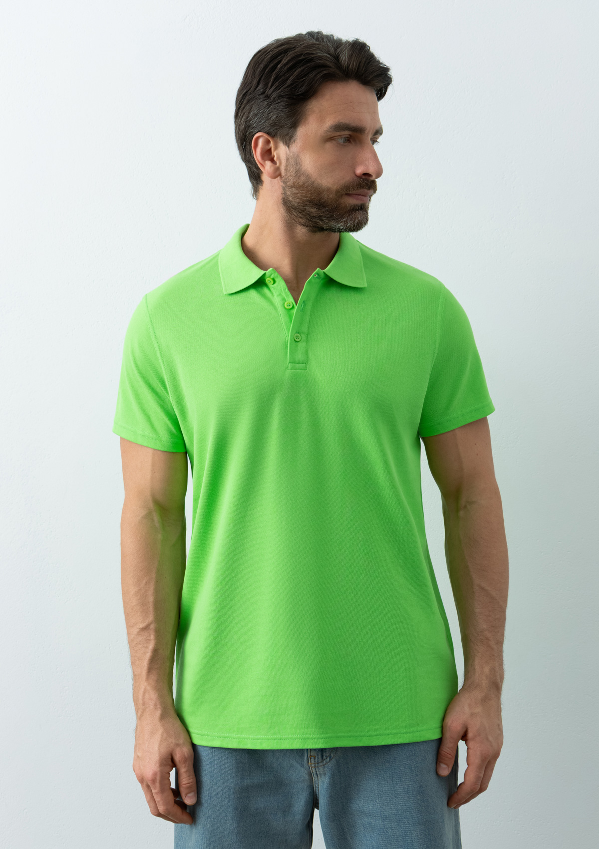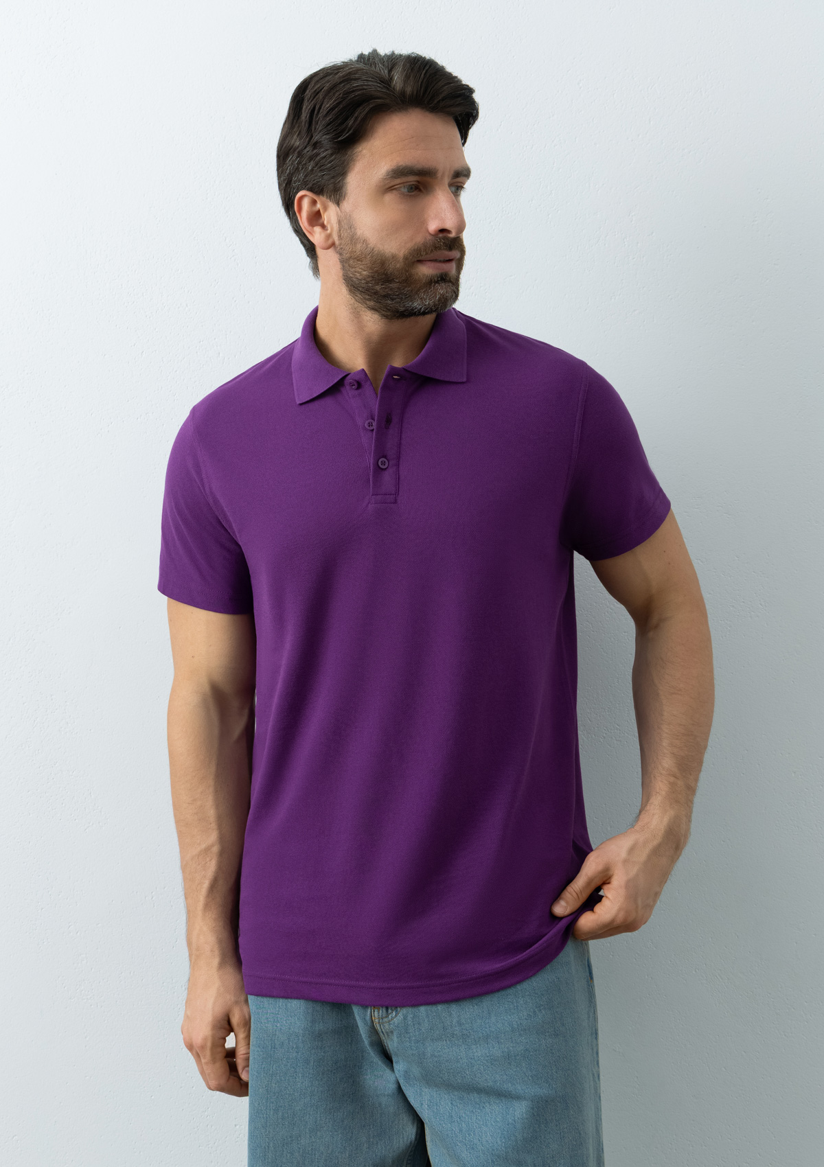 Мужское поло прямого силуэта с отложным воротником, коротким втачным рукавом и застежкой на пуговицы в тон основному цвету.
