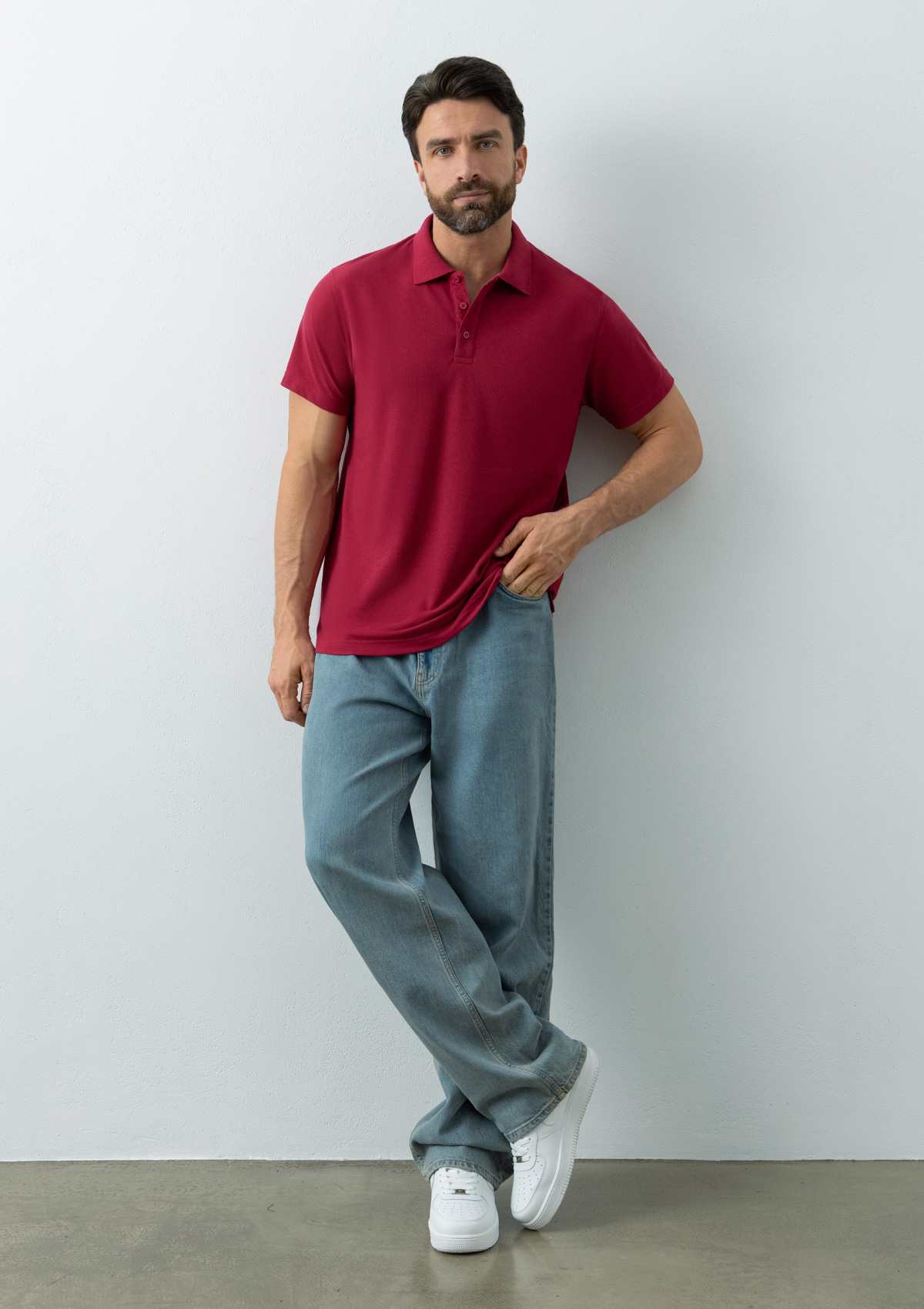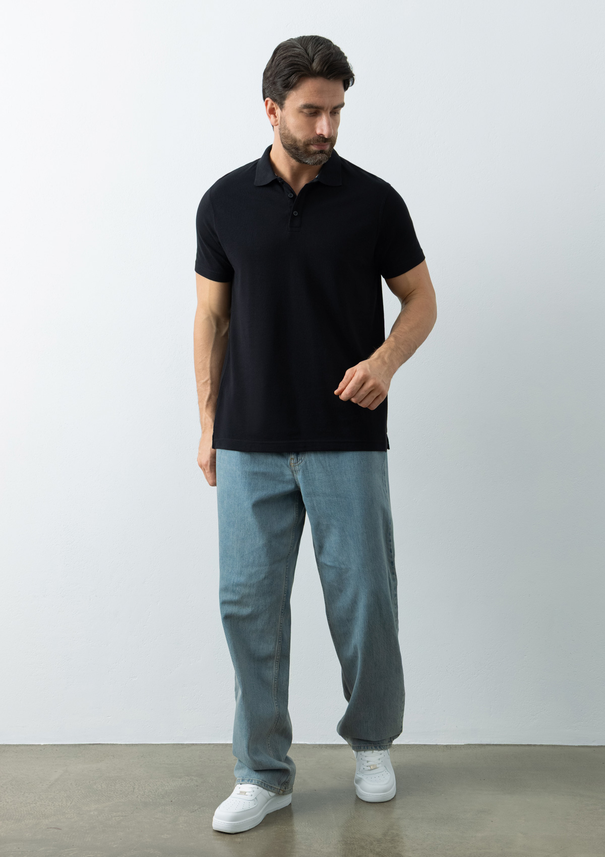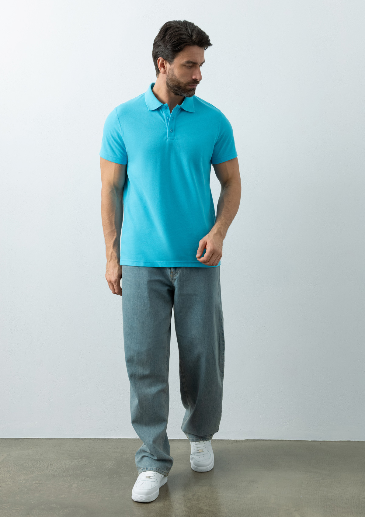 Мужское поло прямого силуэта с отложным воротником, коротким втачным рукавом и застежкой на пуговицы в тон основному цвету.