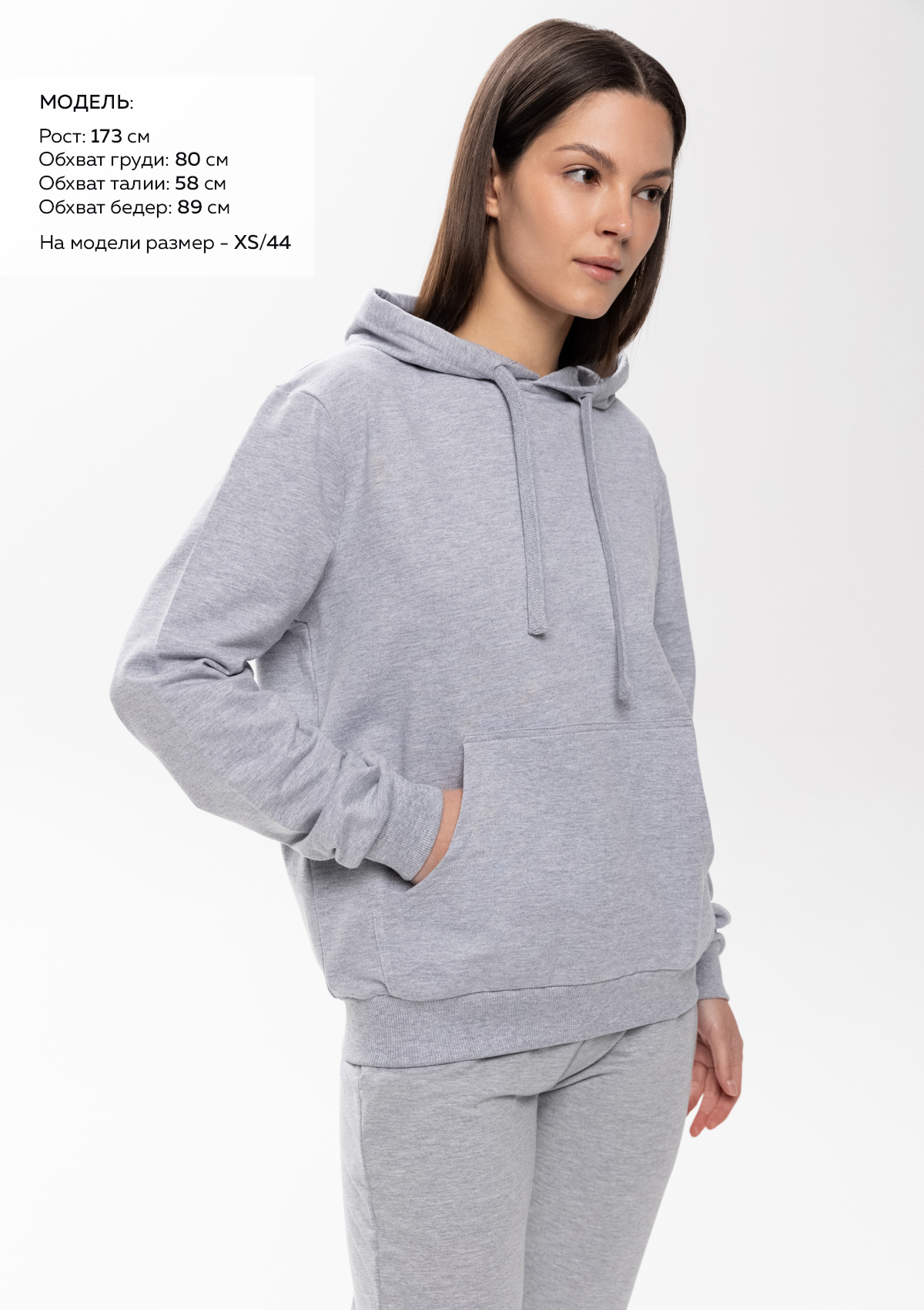 Толстовка прямого силуэта с капюшоном, втачным рукавом и карманом-кенгуру. Капюшон дополнен шнурком для регулирования прилегания, манжет и низ изделия оформлены широкой эластичной резинкой. Возможно два варианта исполнения: контрастные шнурок и бейка/шнурок и бейка в цвет толстовки.