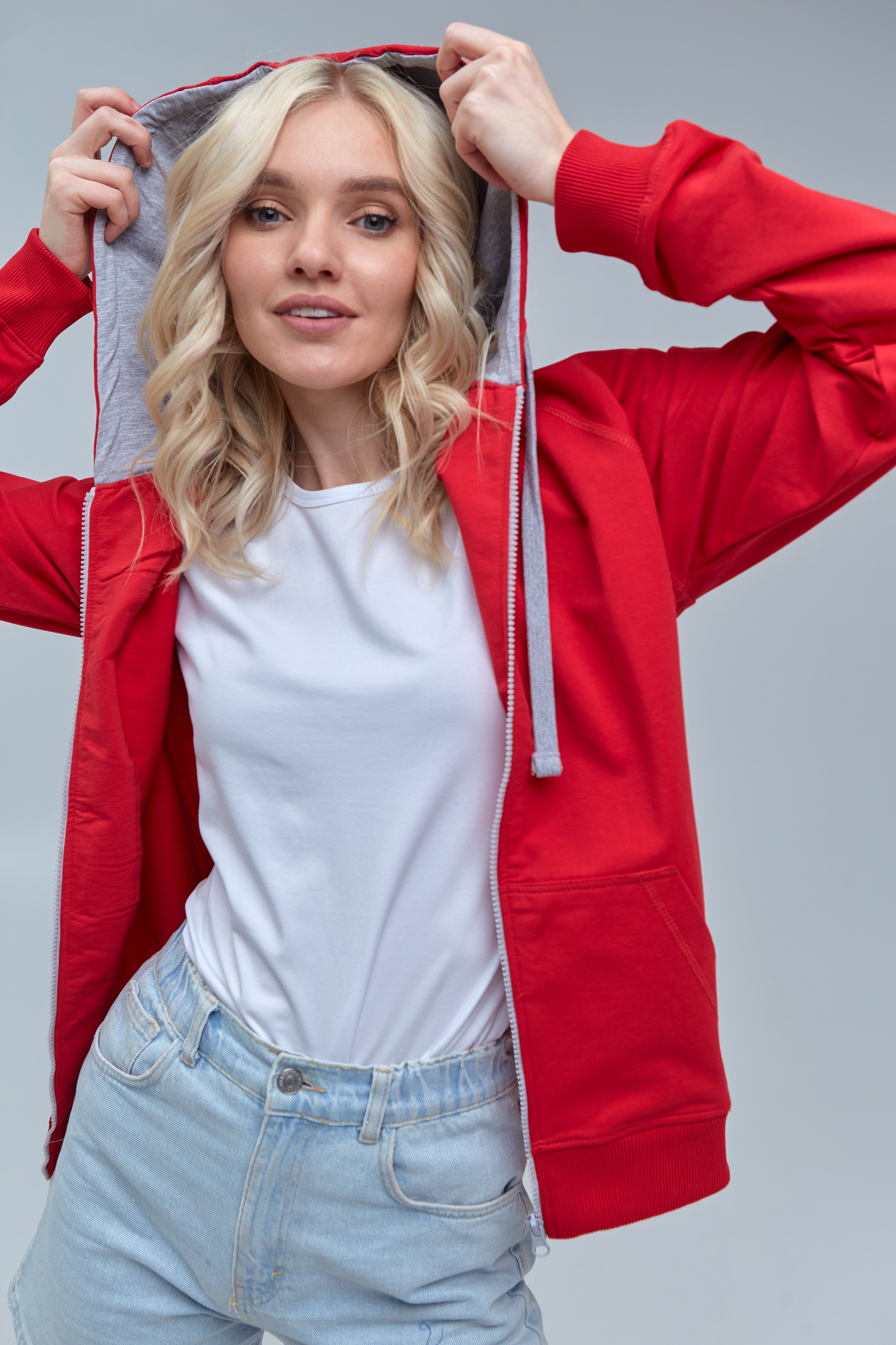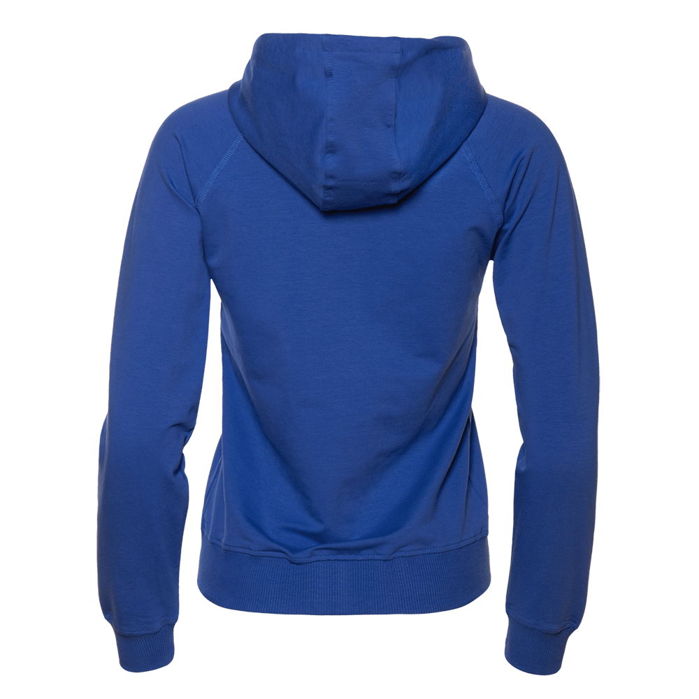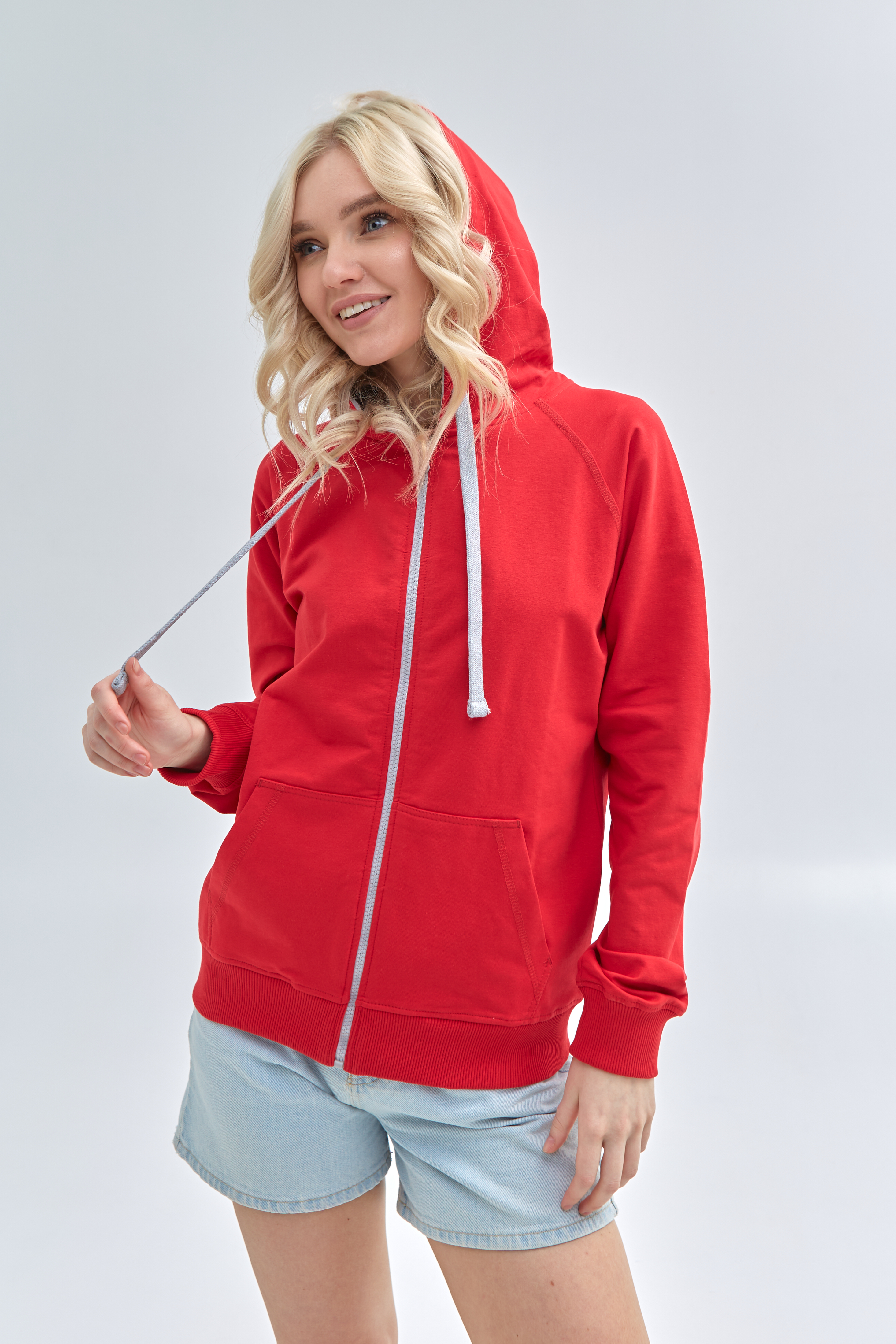 Женская олимпийка прямого силуэта с капюшоном комфортной глубины, рукавом-реглан, накладным карманом и застежкой на контрастную молнию. Капюшон дополнен шнурком для регулирования прилегания, манжет и низ изделия оформлены широкой эластичной резинкой.