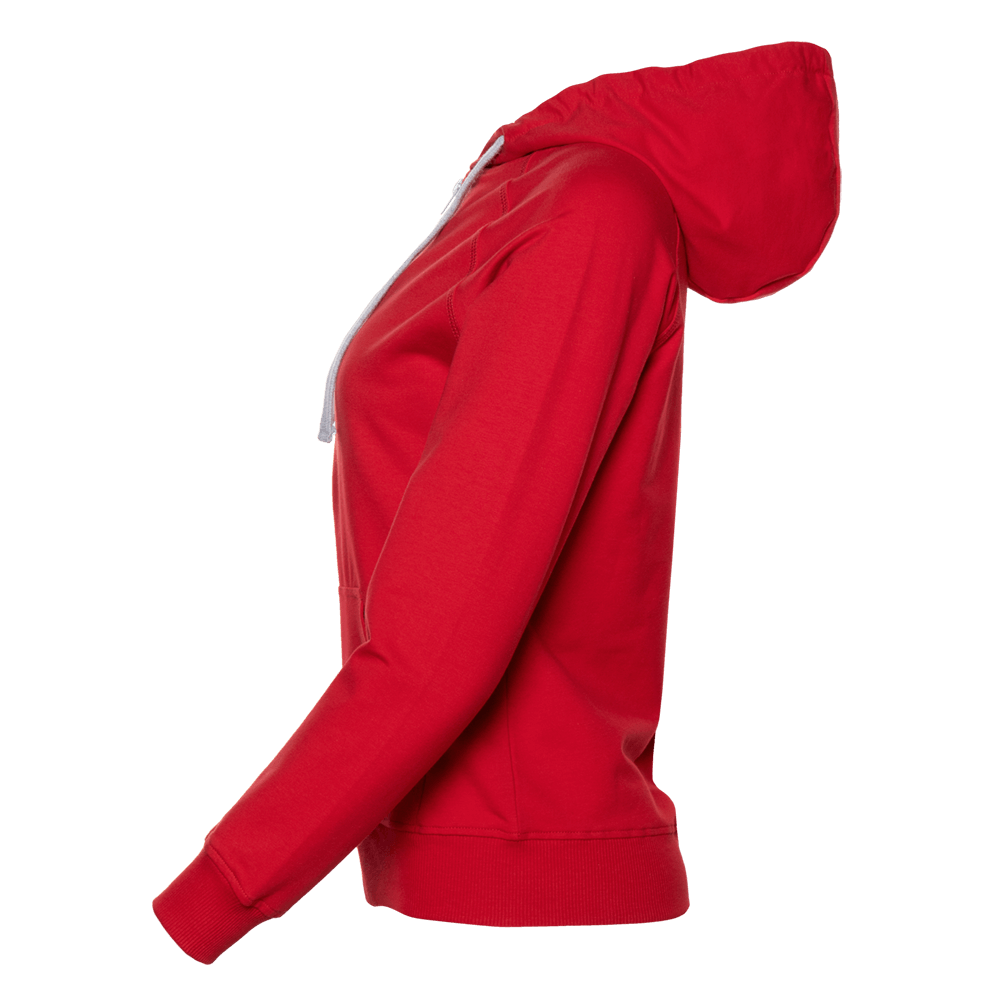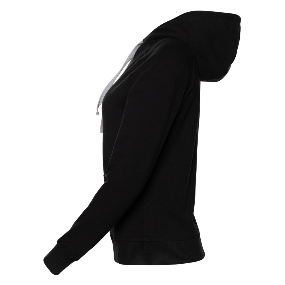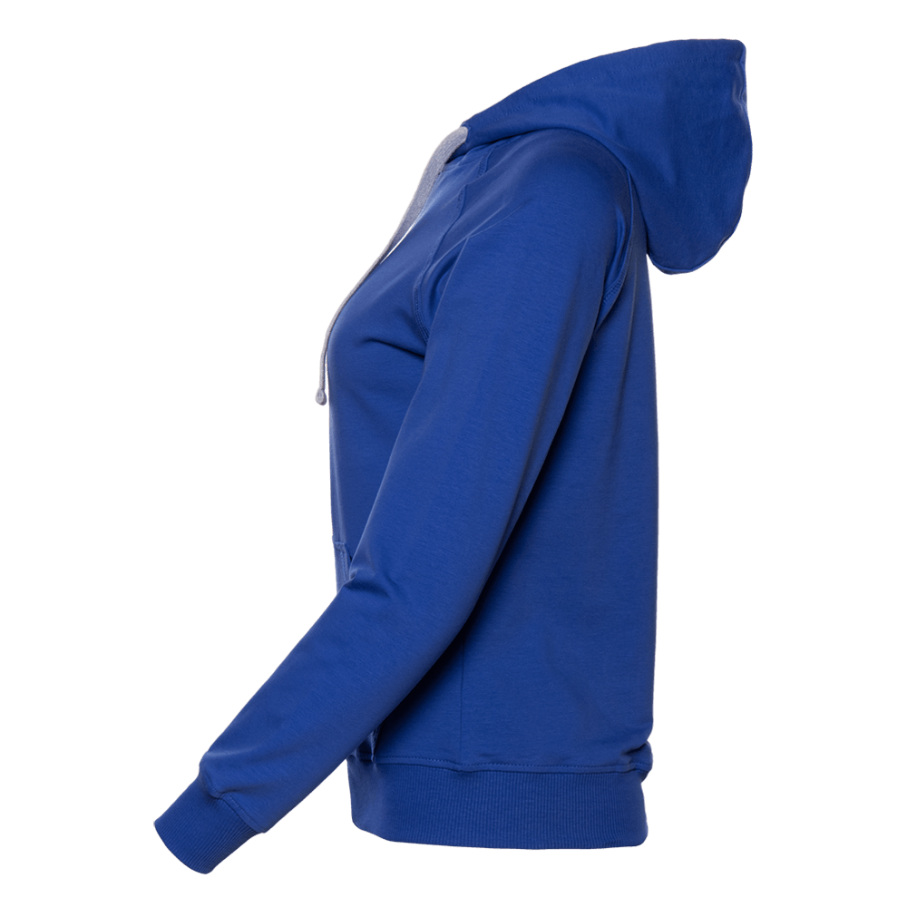 Женская олимпийка прямого силуэта с капюшоном комфортной глубины, рукавом-реглан, накладным карманом и застежкой на контрастную молнию. Капюшон дополнен шнурком для регулирования прилегания, манжет и низ изделия оформлены широкой эластичной резинкой.