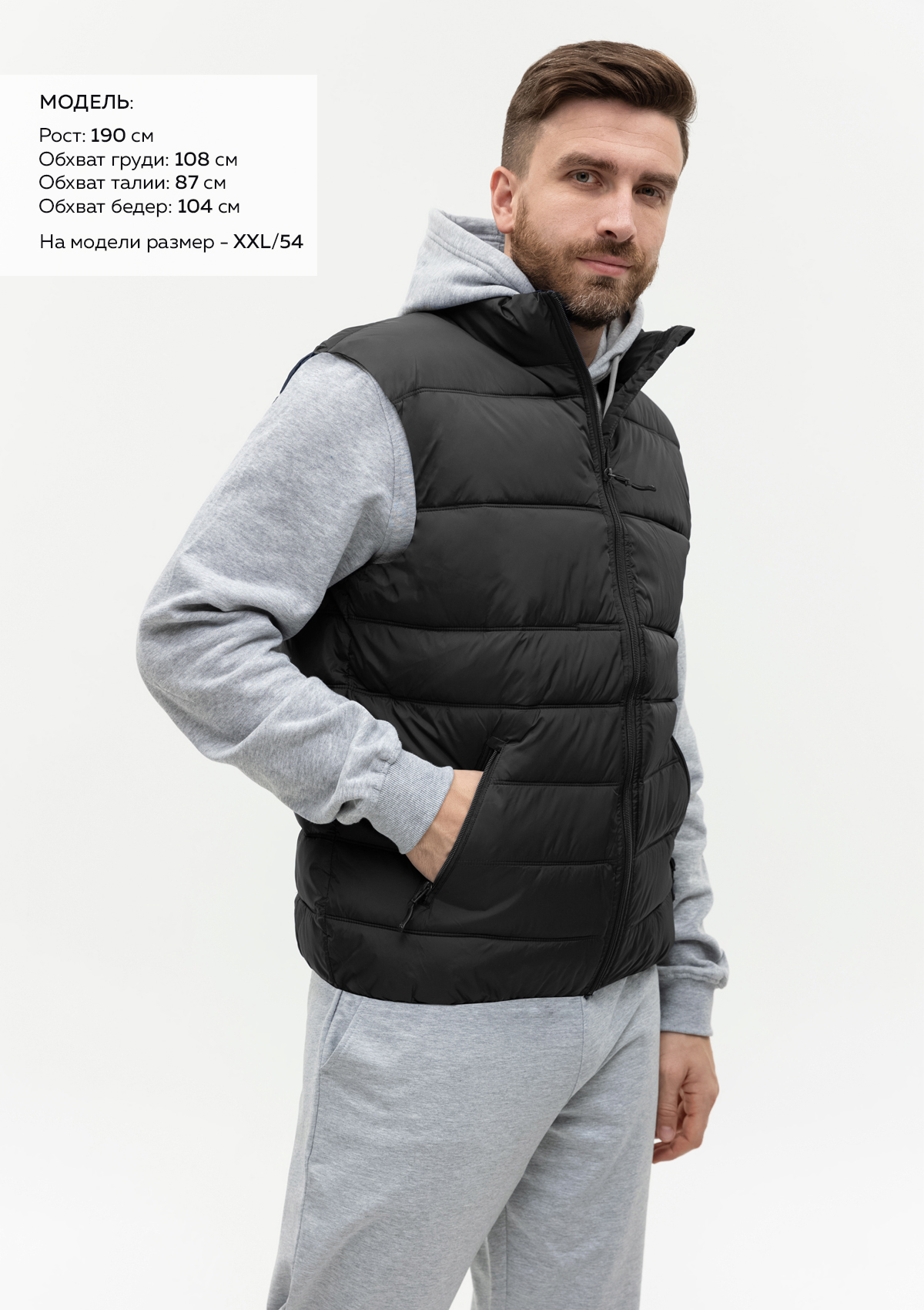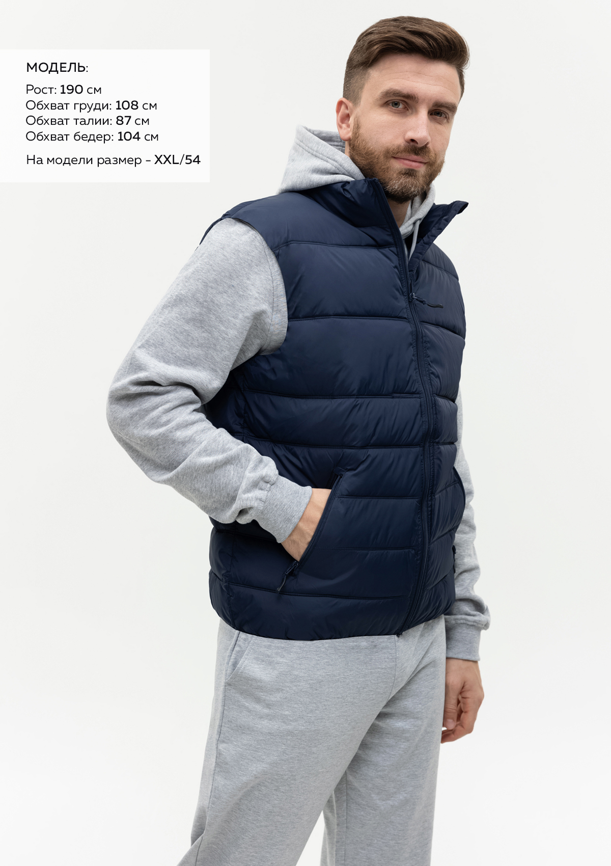 Размер на модели: XXL/54. Параметры модели: рост 190 см.; обхват груди 108 см.; обхват талии 87 см.; обхват бедер 104 см..