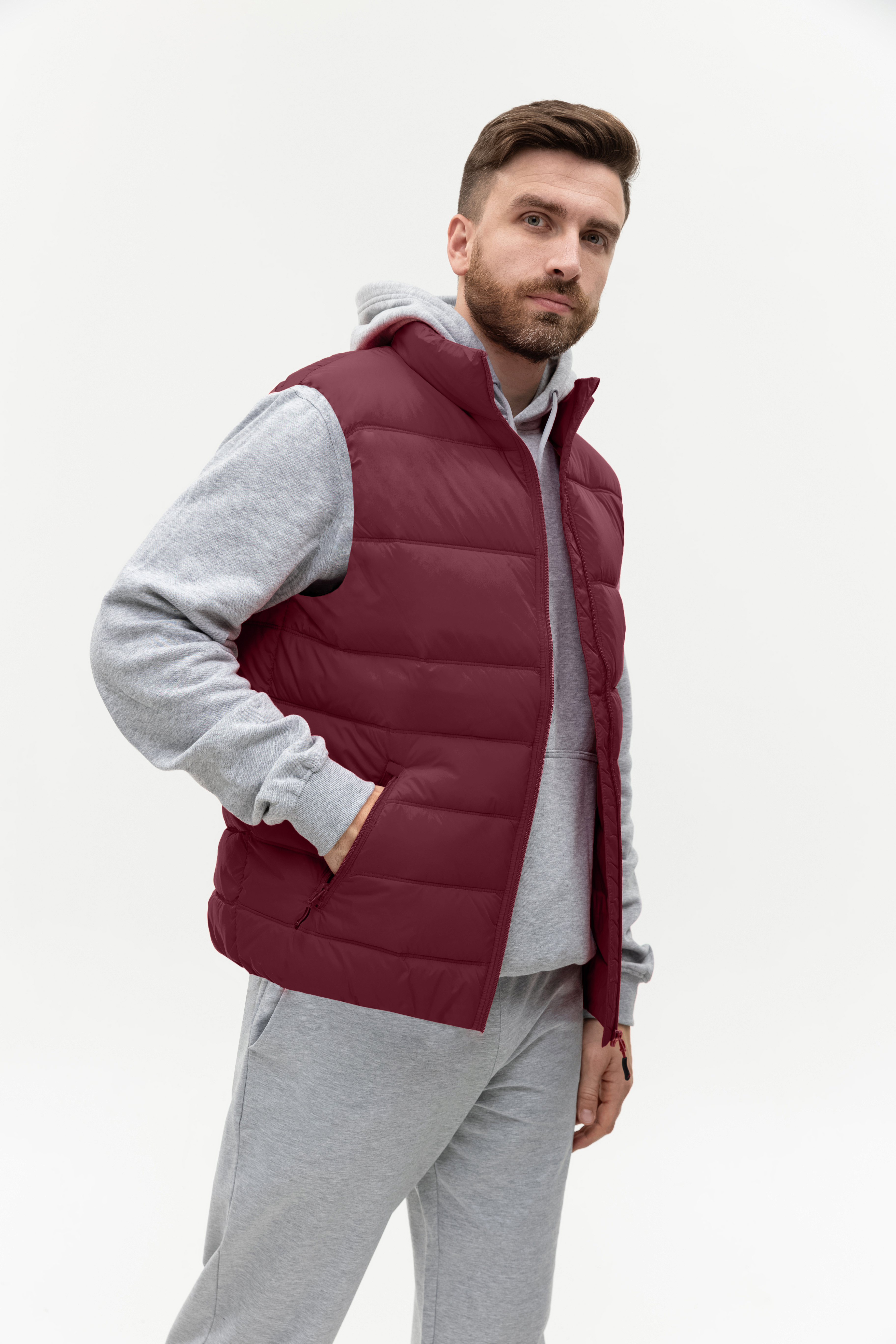 Мужской жилет прямого силуэта с геометричной стежкой, воротником-стойкой, прорезным карманом и застежкой на молнию. Изделие дополнено резинкой по пройме и линии низа для дополнительной защиты от холода и ветра.